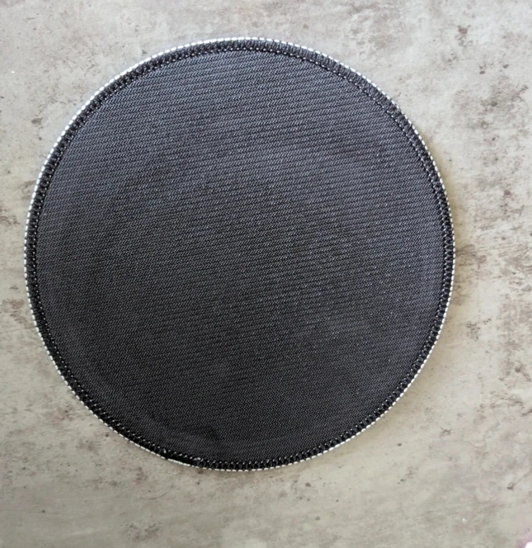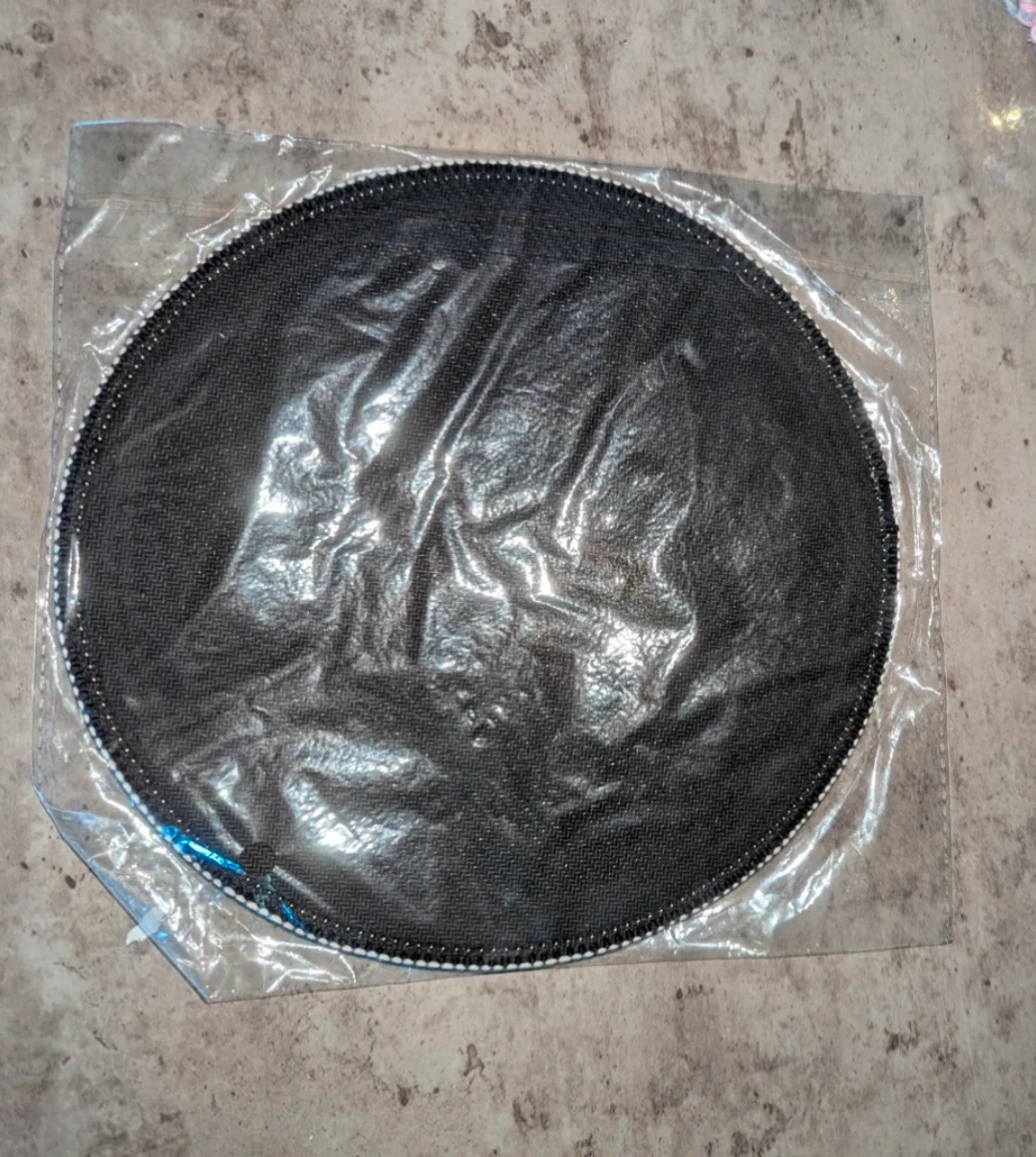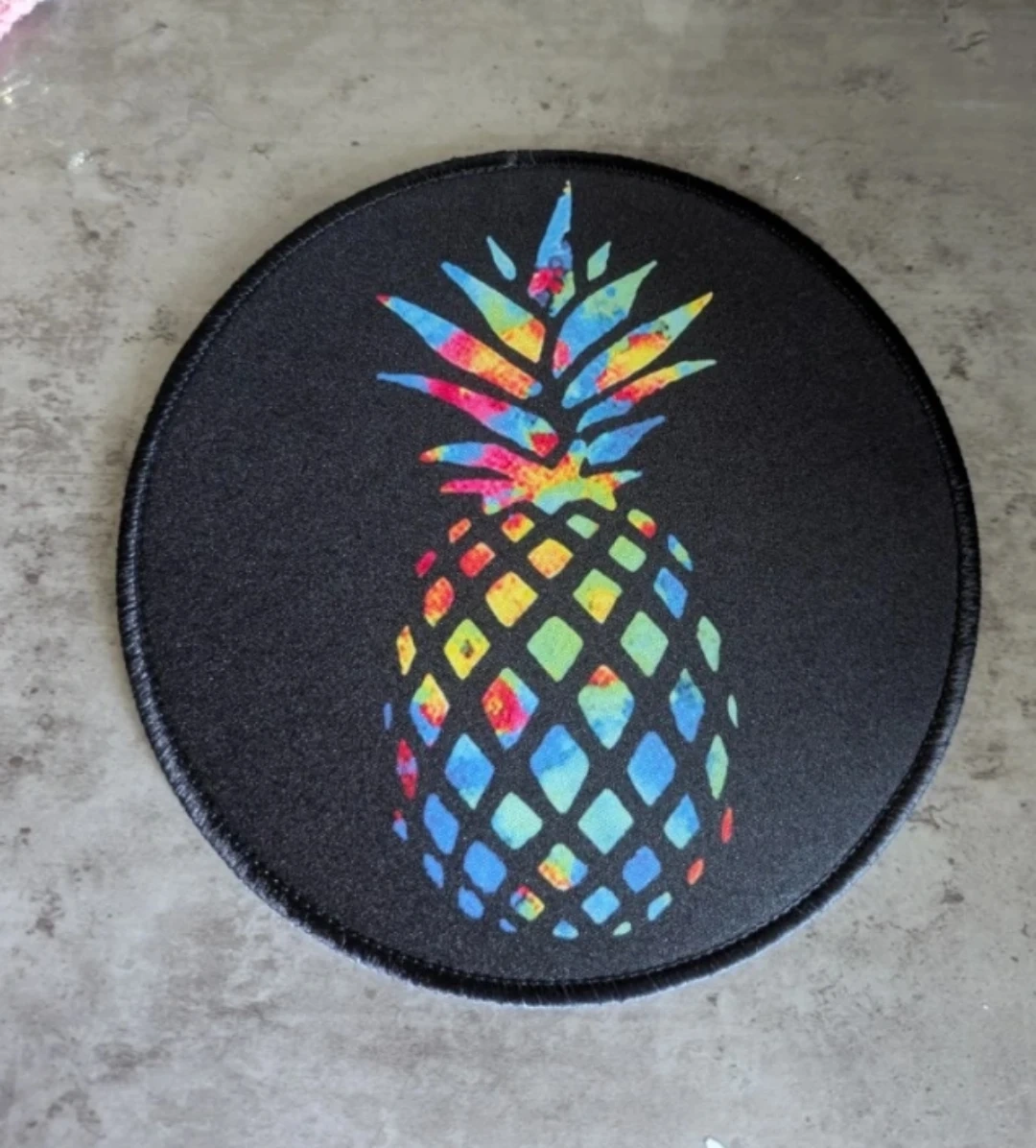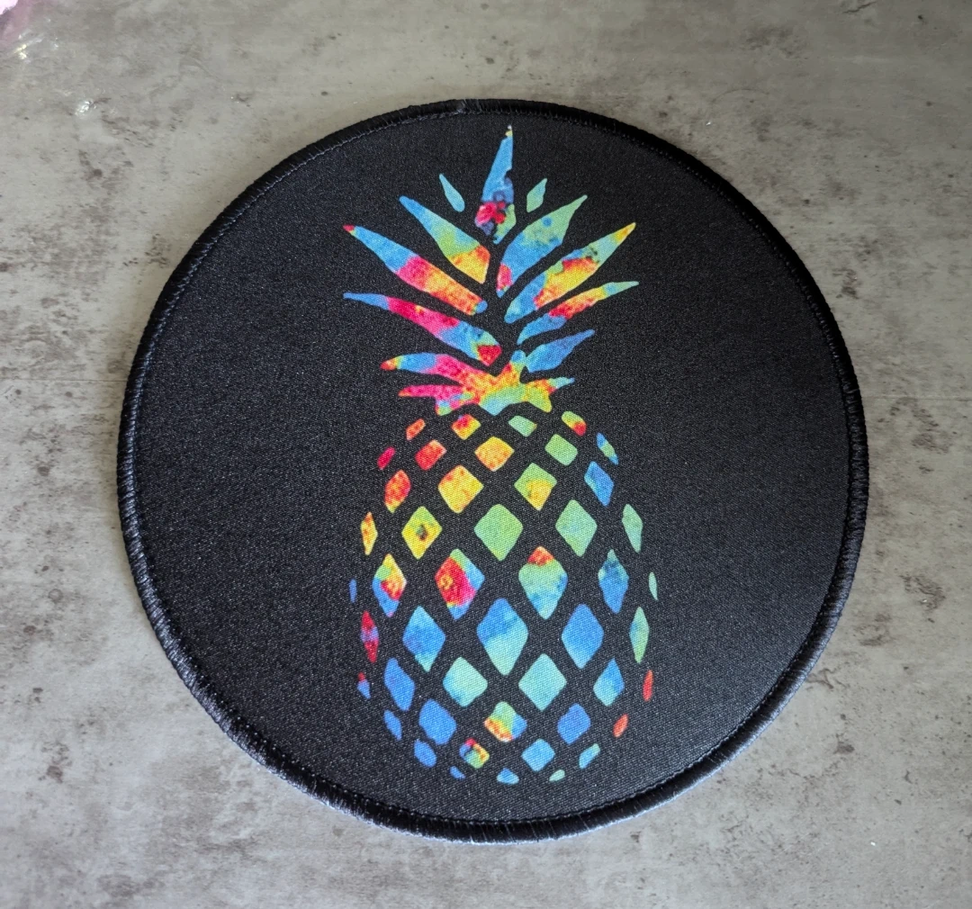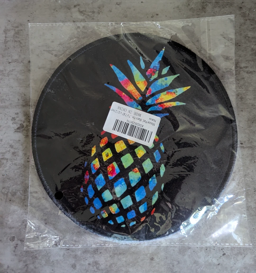 This is a new mouse pad featuring a black background with a colourful pineapple design. It's round and measures 7.87 x 7.87 x 0.12 inches