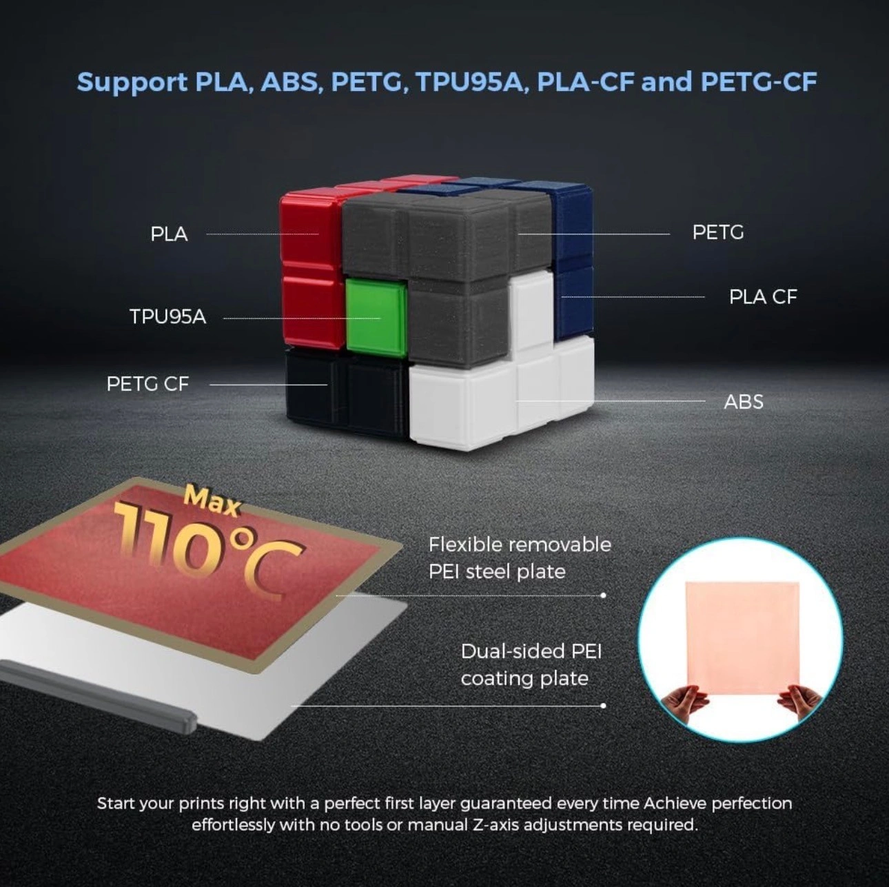 【Robust designs for superior quality】Open 3D printer, Suitable for use in open and, well-ventilated environments, Flexible removable PEI steel plate support PLA/PETG/TPU (0.4mm nozzle) and PLA-CF/PETG-CF (0.6mm nozzle).