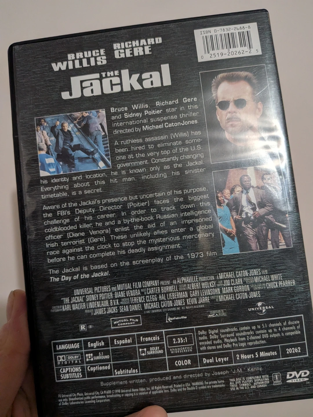 180Selling a copy of The Jackal on DVD, starring Bruce Willis and Richard Gere! It's the collector's edition, widescreen version. A classic thriller for your movie collection No scratches Cash only, No etransfers Cross listed * Discount on multiple item purchases Location: Etobicoke. Rathburn Rd and Renforth dr. Etobicoke Olympium nearby. 5 mins from Pearson Airport