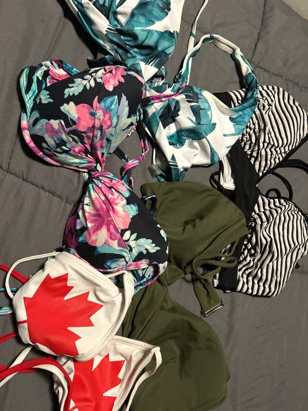 Selling a mixed lot of swimsuits tops.There are a few different styles and patterns, including stripes, floral, and a Canadian flag print. Perfect for summer!
