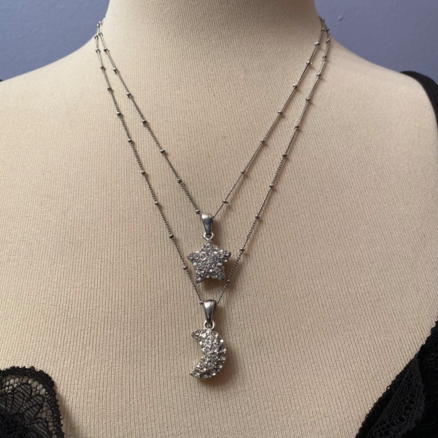 A cute layered necklace featuring a star and moon pendant! The chains are a delicate silver colour. Pendants have tiny rhinestones and sparkle in the light ✨ Very pretty and great quality.