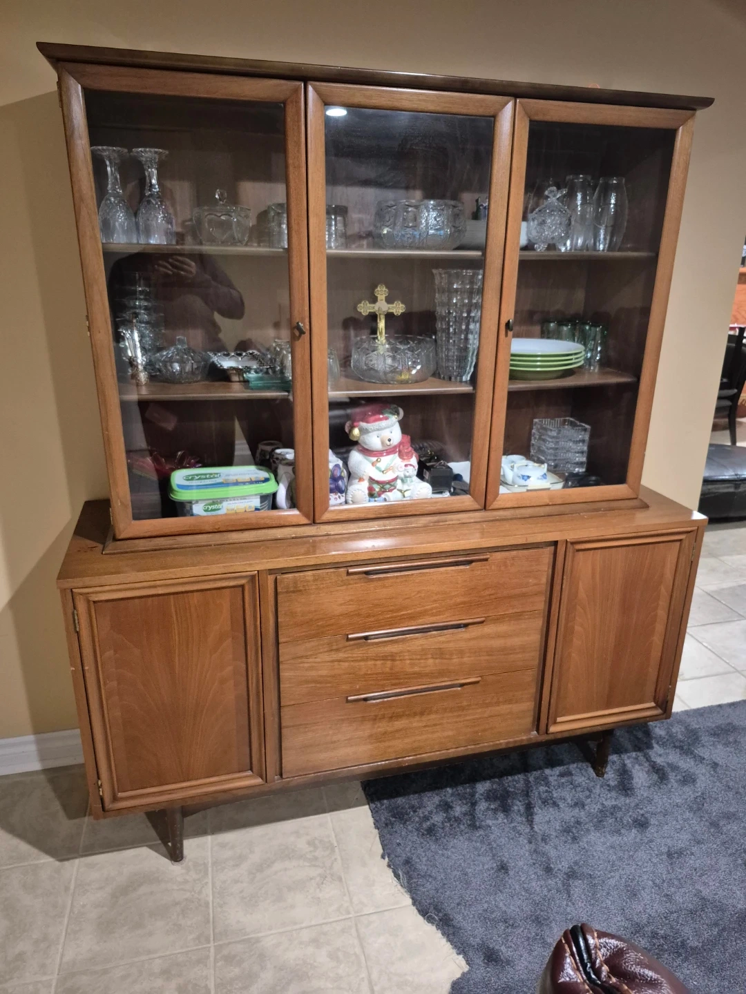Selling a lovely wooden china cabinet! It features glass doors on the upper section, perfect for displaying your favourite dishes or collectibles. The lower section has drawers and cabinets for extra storage. It's in good condition and would make a great addition to any dining room or living space