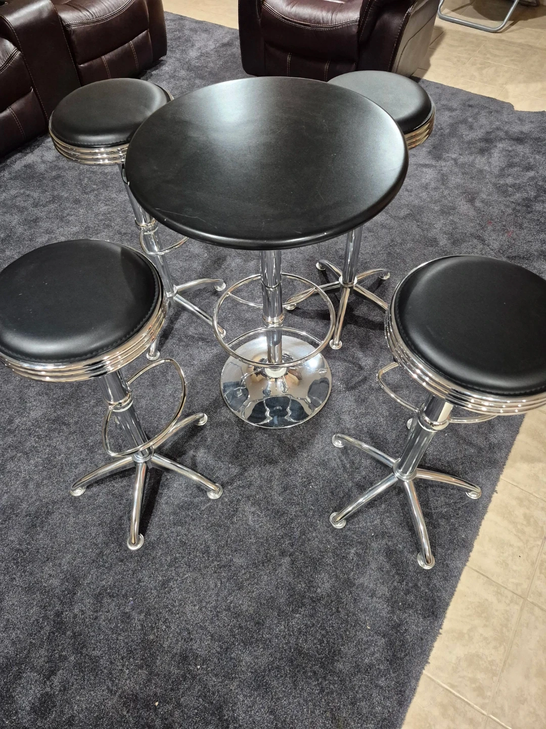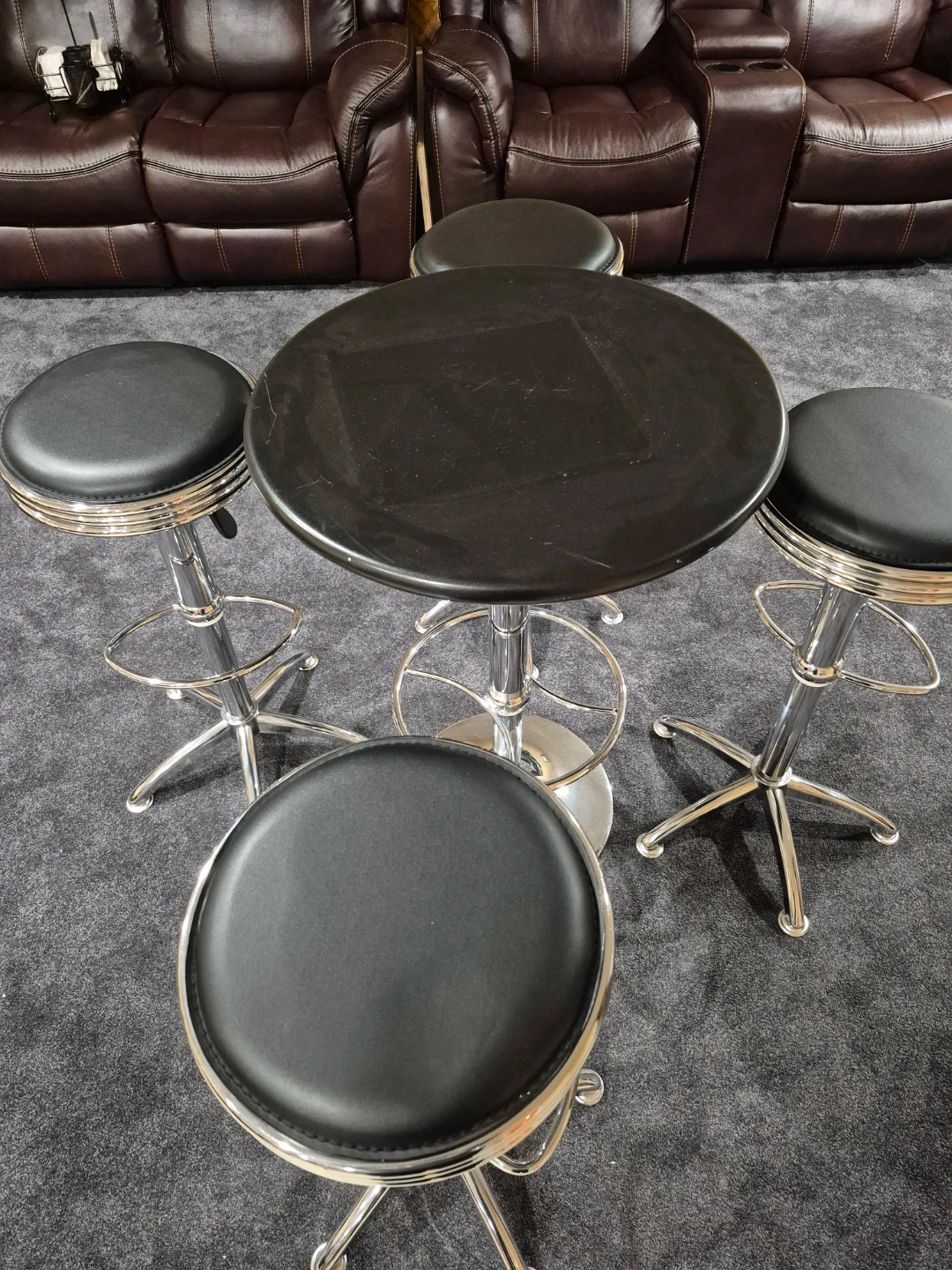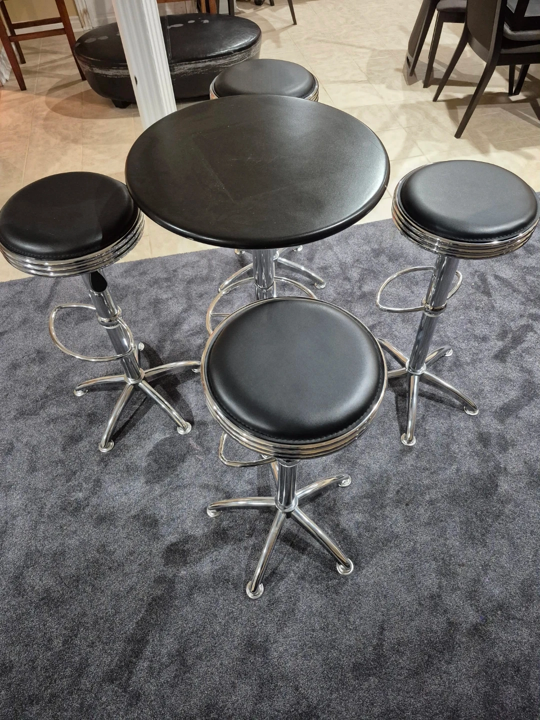 10Selling a retro-style pub table with four matching stools. The set features a black tabletop and seat cushions, complemented by chrome-finished legs and accents. Perfect for adding a touch of vintage diner charm to your kitchen or rec room!