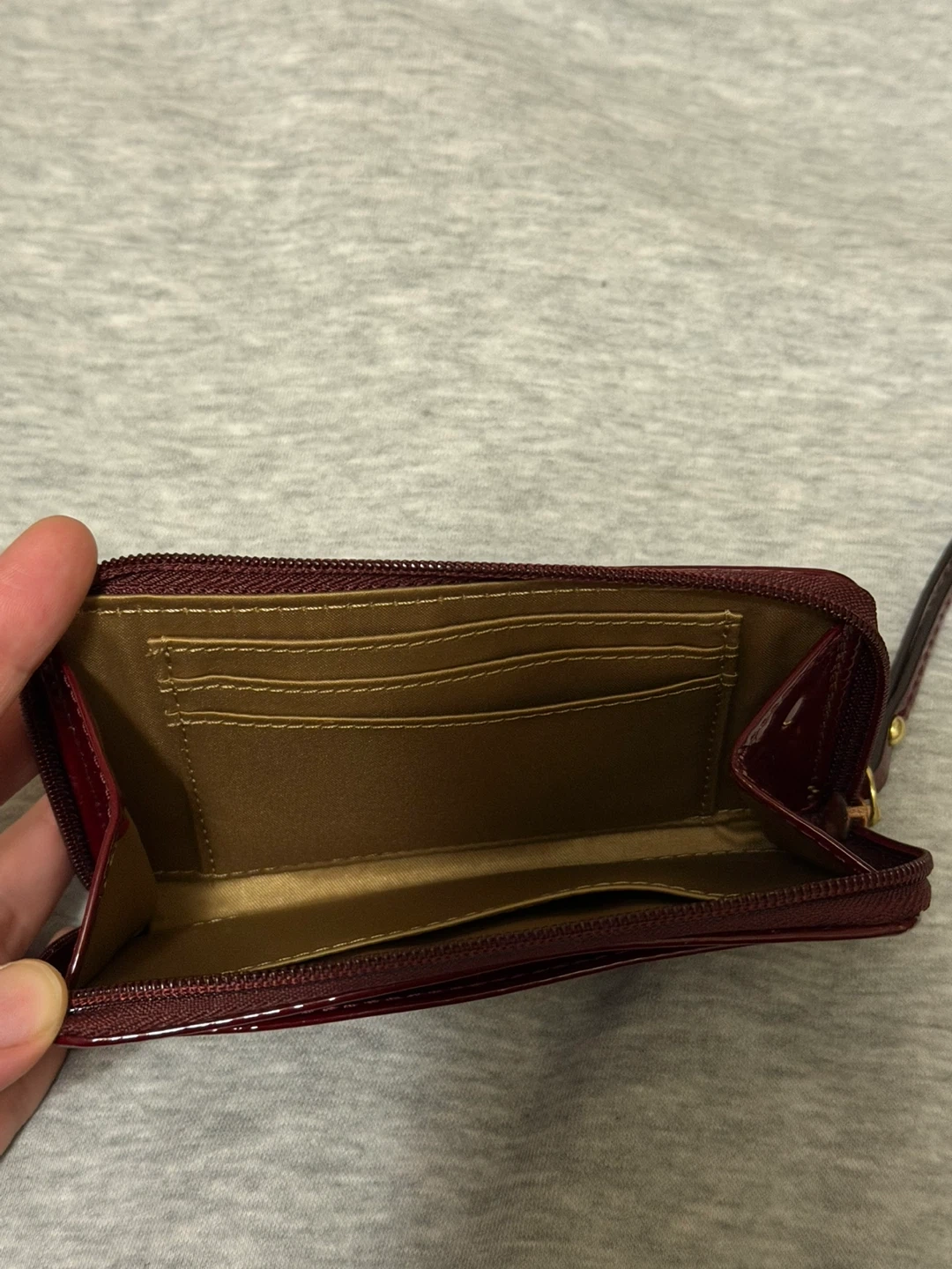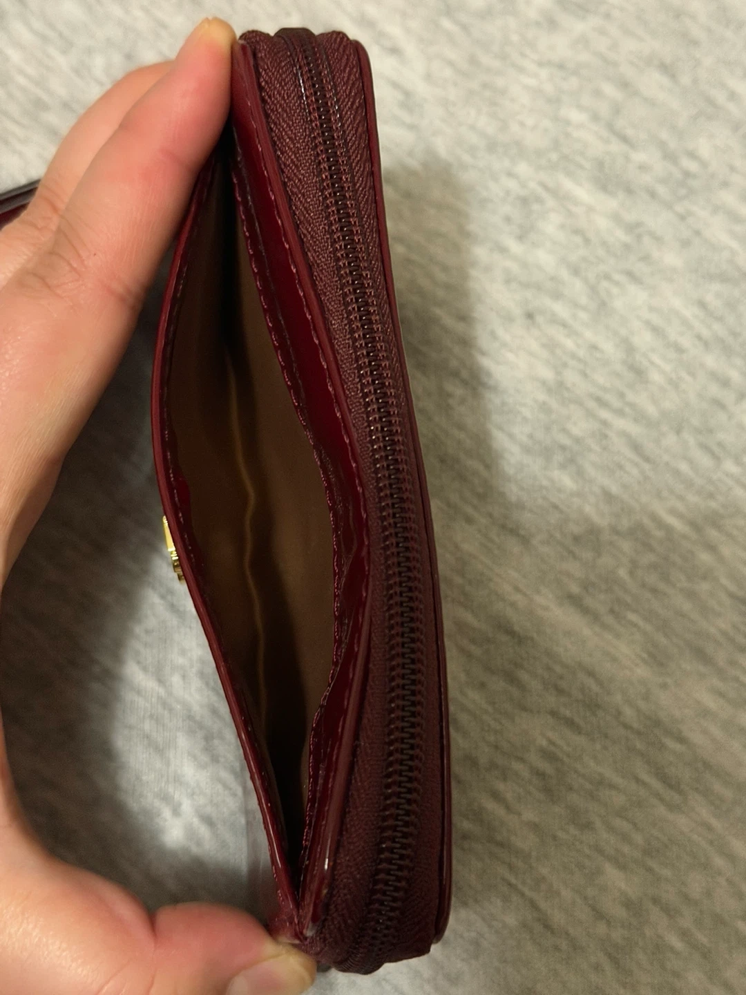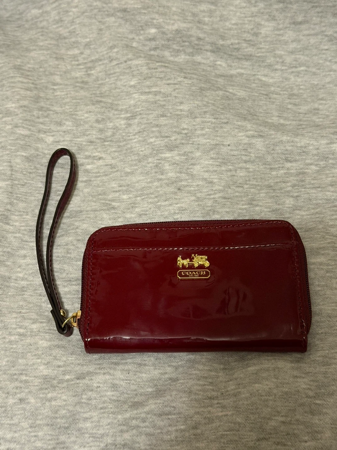 Selling a Coach wristlet wallet in a beautiful burgundy patent leather. It's in great condition and perfect for carrying your essentials!