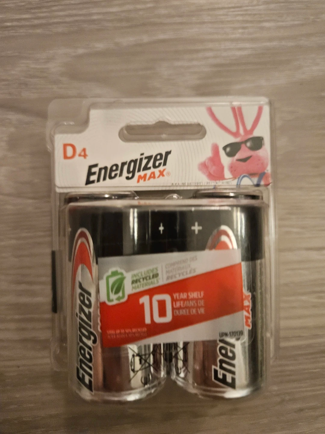 Selling a pack of Energizer MAX D4 alkaline batteries! This pack includes 4 batteries and has a long shelf life.