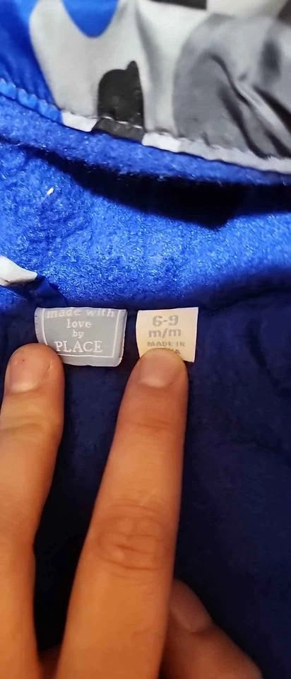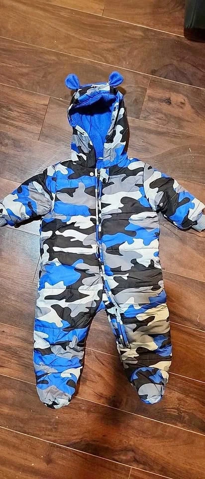Waterproof infant snowsuit from the Children's Place for 6-9 month olds. Built in insulated feet, and has a fleece lining. Hood comes with adorable little teddy ears!