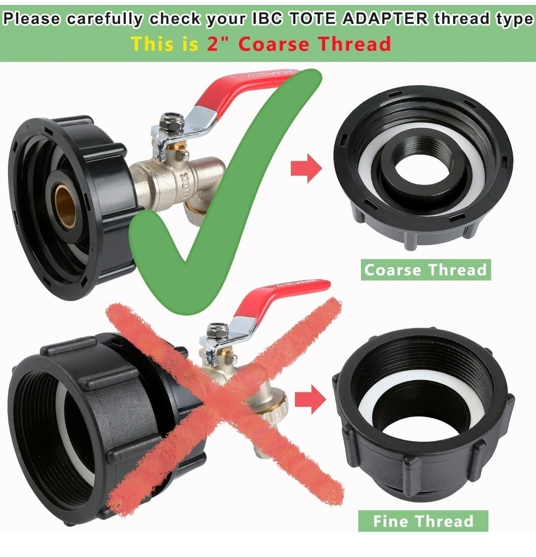 85Selling a 1/2" Leakproof Brass IBC Tote Fittings - IBC Tote Adapter. This adapter is designed for 2" coarse thread and is perfect for 275-330 gallon water tanks. It's great for garden hose connections and replacing valve fittings, especially for winterizing