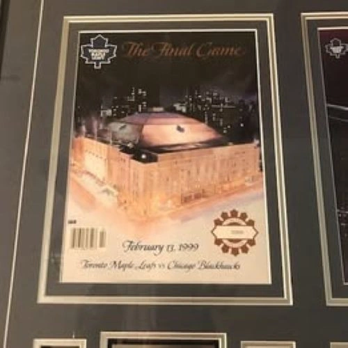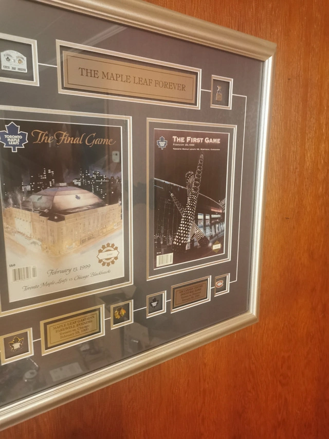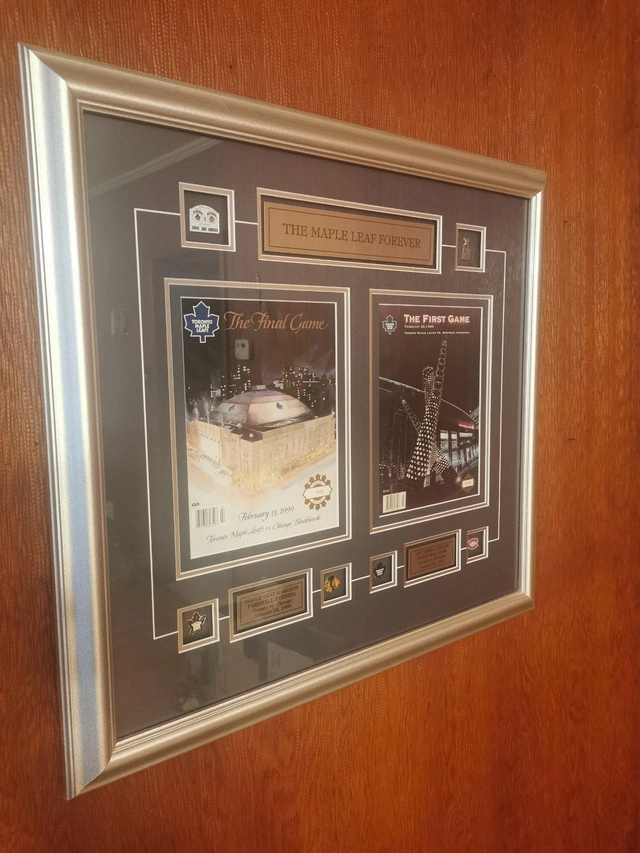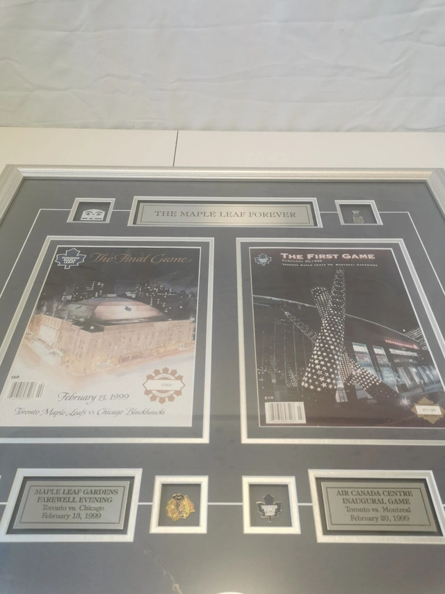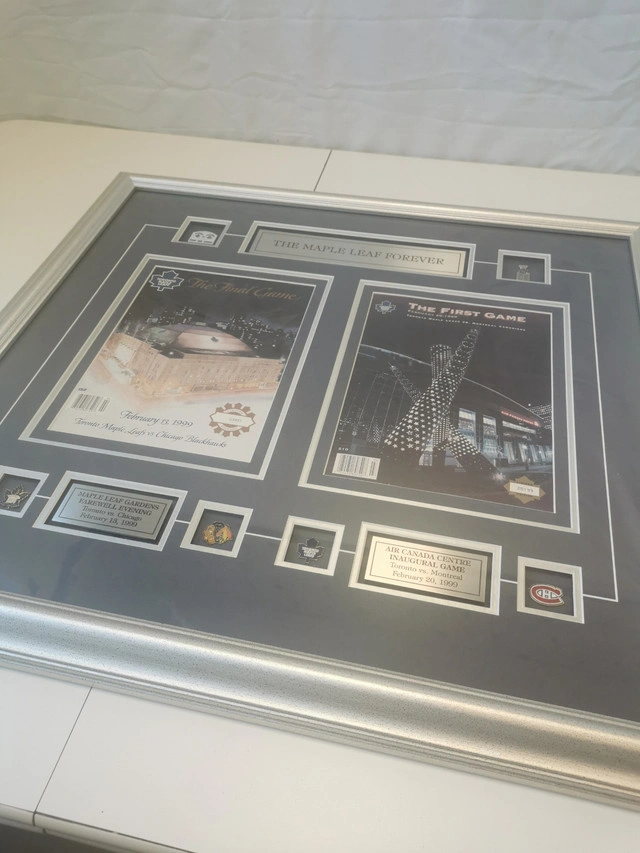 60Set of two framed official programs from the last game at Maple Leaf Gardens and the first game at Air Canada Centre in Toronto, Ontario Canada. These programs are from the National Hockey League (NHL) and feature the Toronto Maple Leafs, Chicago Black Hawks, and Montreal Canadian's teams. Perfect for collectors or fans looking to commemorate special moments in hockey history and to possess a piece of it. Condition: Light wear good vintage condition Dimensions: 28 inches length by 26 inches width by 1.5 inches approx.