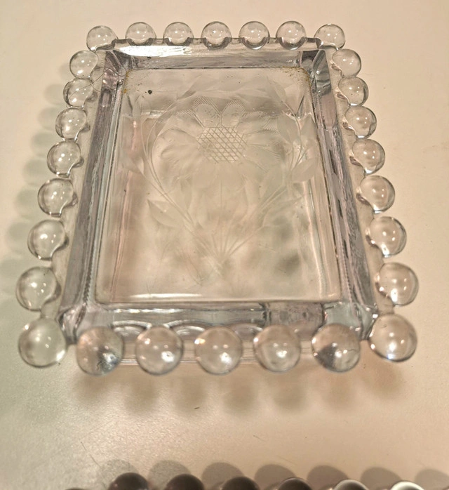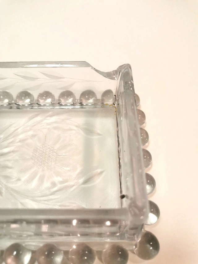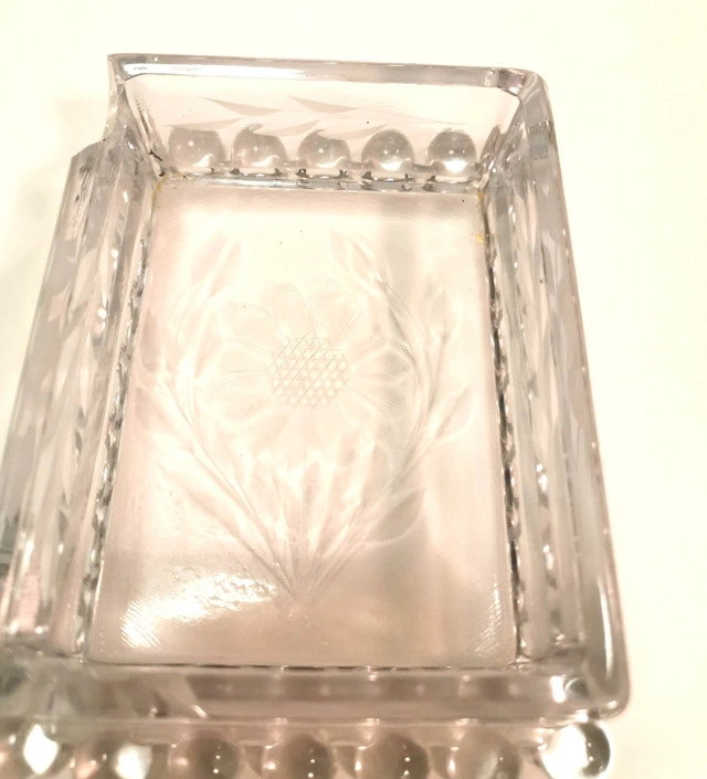 Antique decorative glass container with etched glass and modern charm. It features a sleek design with a snug lid. Crafted from high-quality clear glass with hobnail. CONDITION: Two internal chips on the inner lip/rim (shown in photos). Otherwise solid condition, no cracks. Dimensions- Length 5.25 inches, Width 4 inches, Height 2.25 inches. Let me know if you're interested!