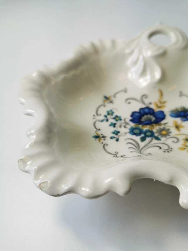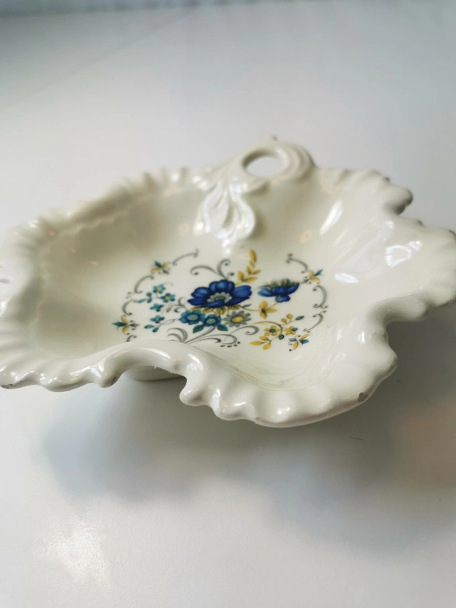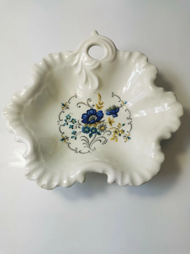 60Made in France classic candy dish with botanical theme, scalloped edges. Dimensions: Length 6 inches, Width 6 inches, Height 1.25 inches. NOTE: Vintage item some small chips on edges predominantly on underside please reference photos.