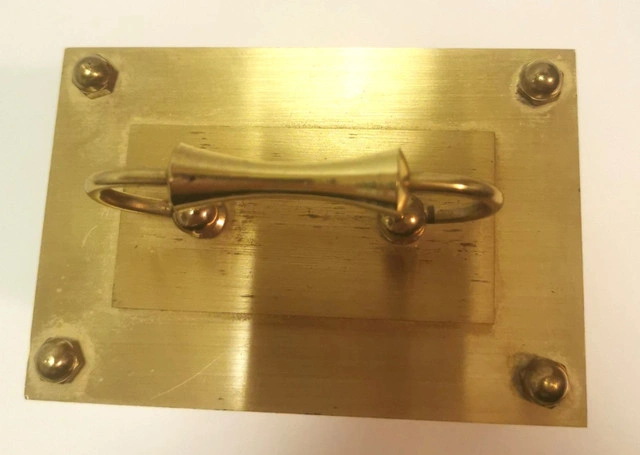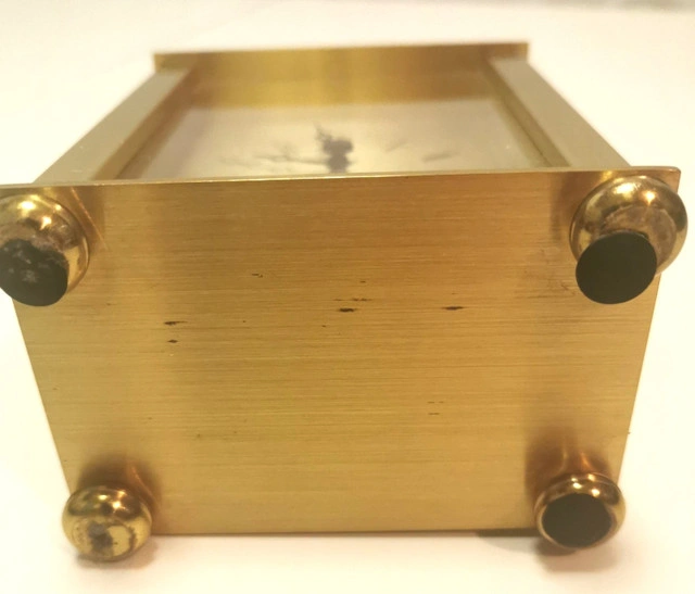 Crafted with precision and elegance, this Equity Quartz desk clock combines the timeless appeal of brass with the durability of quartz. Originating from Hong Kong in the late 20th century, this vintage piece is a testament to classic design and craftsmanship. Its golden hue and analog display provide a warm, inviting touch to any space, making it an ideal addition to your bureau or mantelpiece. The clock is powered by a battery, ensuring fuss-free operation and continuity of timekeeping. The brass frame, finish, and overall vintage charm exude an air of sophistication that is sure to compliment any decor. Whether for personal use or as a thoughtful gift, this desk clock is a harmonious blend of function and style WORKING Good vintage condition light wear on the front base and inside. Please reference photos as they are part of the description of the item. Dimensions- Height 5.75 inches, Width 3.75 inches, Depth 2.75 inches