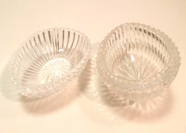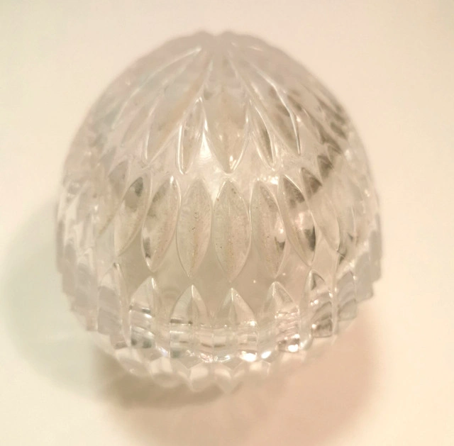 Crafted with meticulous attention to detail, this crystal egg dish with lid is a true gem for collectors and enthusiasts alike. The piece showcases an elegant, clear crystalline structure, capturing the light to create a shimmering display. Its small size makes it a delicate addition to any space, while the unique egg shape adds a touch of whimsy. Vintage charm and individuality. It serves as a versatile piece, suitable for housing real eggs or simply as a decorative ring holder. With its timeless appeal and sparkling crystals, it brings a touch of sophistication to any collection or decor. Condition: Good vintage condition very light wear please reference photos as they make up part of the description of the item. Dimensions- Length 5 inches, Width 4 inches, Height 3.5 inches