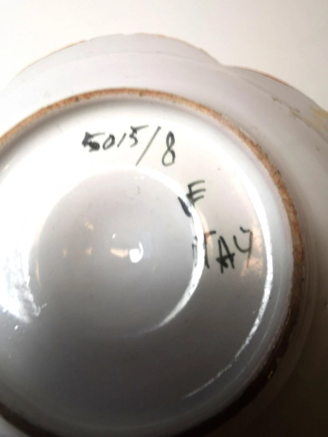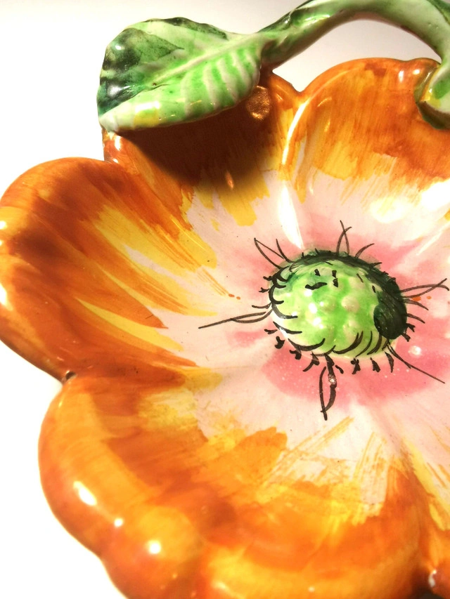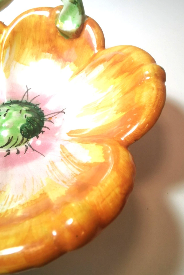 This vintage candy dish is handmade and hand-painted in Italy, featuring a beautiful floral pattern in multicolor. The round ceramic dish has a glossy finish and is a unique piece of art pottery from the 1970s. It is signed by the artisan and exudes a charming, rustic appeal perfect for adding a touch of Italian flair to any decor. Dimensions: Diameter 6 inches, Height 1.75 inches NOTE: Vintage item with light wear hairline crack on bottom, please reference photos