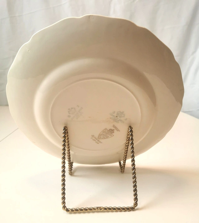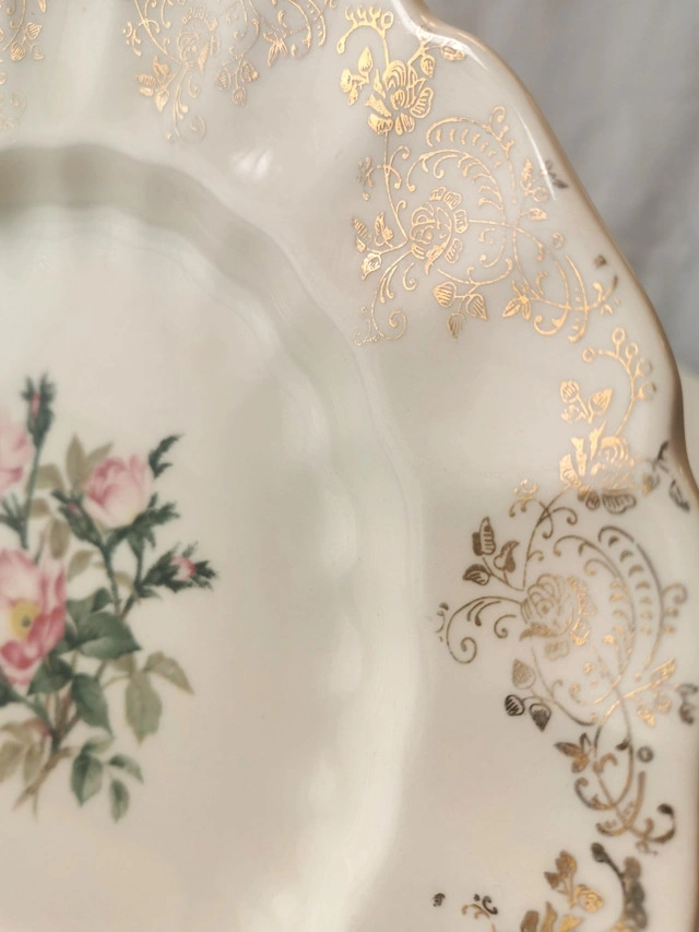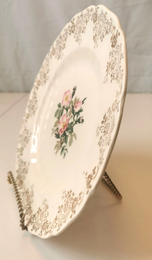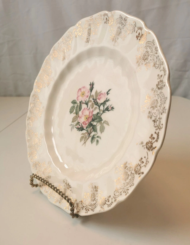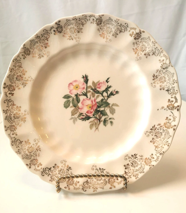 This Johnson Brothers dinner plate exudes a timeless elegance that's perfect for any occasion. Featuring a classic white backdrop, the plate is adorned with intricate botanical designs. Made in the United States in 1959. The plate reflects the era's aesthetic with its decorative features and the Sovereign Potters Canada decoration. Dimension- 10 inches. Vintage plate from 1959 in good shape with very slight wear on underside. Please reference photos.