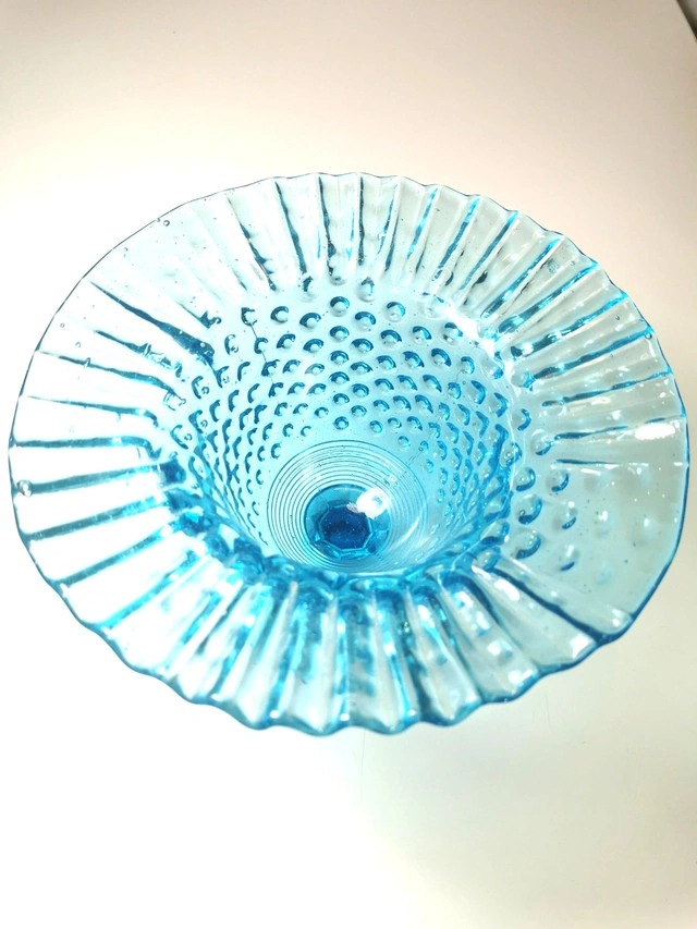 The Pedestal Dish UV Reactive Fenton Aqua Blue Hobnail Ruffled Bowl with a Wave is a stunning decorative bowl made of crystal by the brand Fenton. The bowl features a diamond pattern and a beautiful aqua blue color, adding a touch of elegance to any space. Its unique design and UV reactive properties make it a standout piece for collectors or those looking to enhance their home decor with a touch of vintage charm. Dimensions: Height 6.25 inches, Diameter at widest point 7.25 inches CONDITION: Vintage condition light wear please reference detailed photos as they are part of the description of the item.