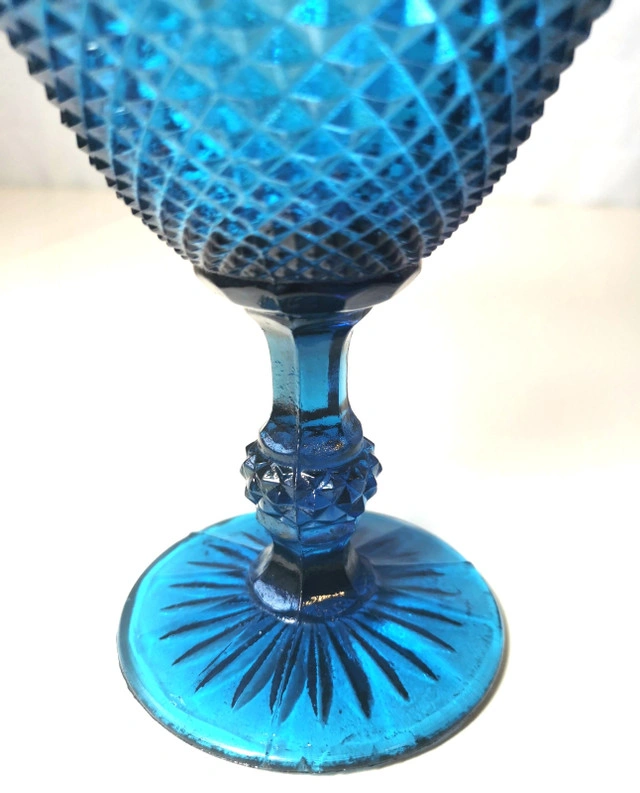 Vintage Candy Dish Pedestal made by Ivima in the 1960s, featuring a cool blue diamond pattern in IVIMA Point Glass Compote. This piece was made with quality, reflecting the art glass production style of the time period. Manufactured in Portugal, this unique and decorative piece is perfect for adding a touch of retro charm to any home decor setting. Dimensions: Height 5.75 inches, Diameter 6 inches approx. Good vintage condition. There is a small chip on the bottom of the base, which does not affect display or use. Please review all photos carefully, as they form part of the item description.