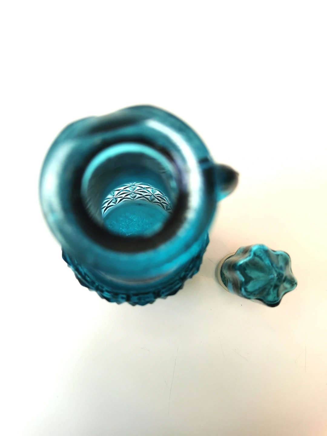 Beautiful vintage blue glass container or display piece. Vintage condition, chip as per photos, otherwise light wear. Dimensions: 8.75 inches height, 3 inches diameter at widest point. Meetup is in Bradford, I work from home and can meet anytime with a bit of notice.