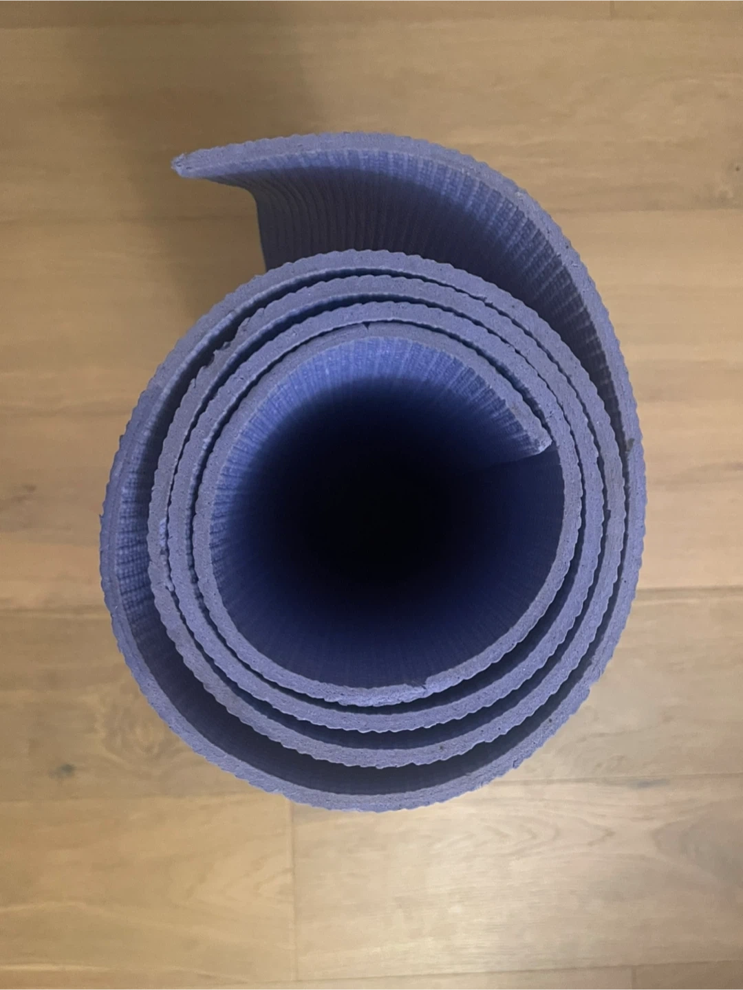 Yoga mat with a pretty floral design! It's in okeyish condition as seen in photos, with clear signs of use, but still in good shape and usable for yoga and workouts.
