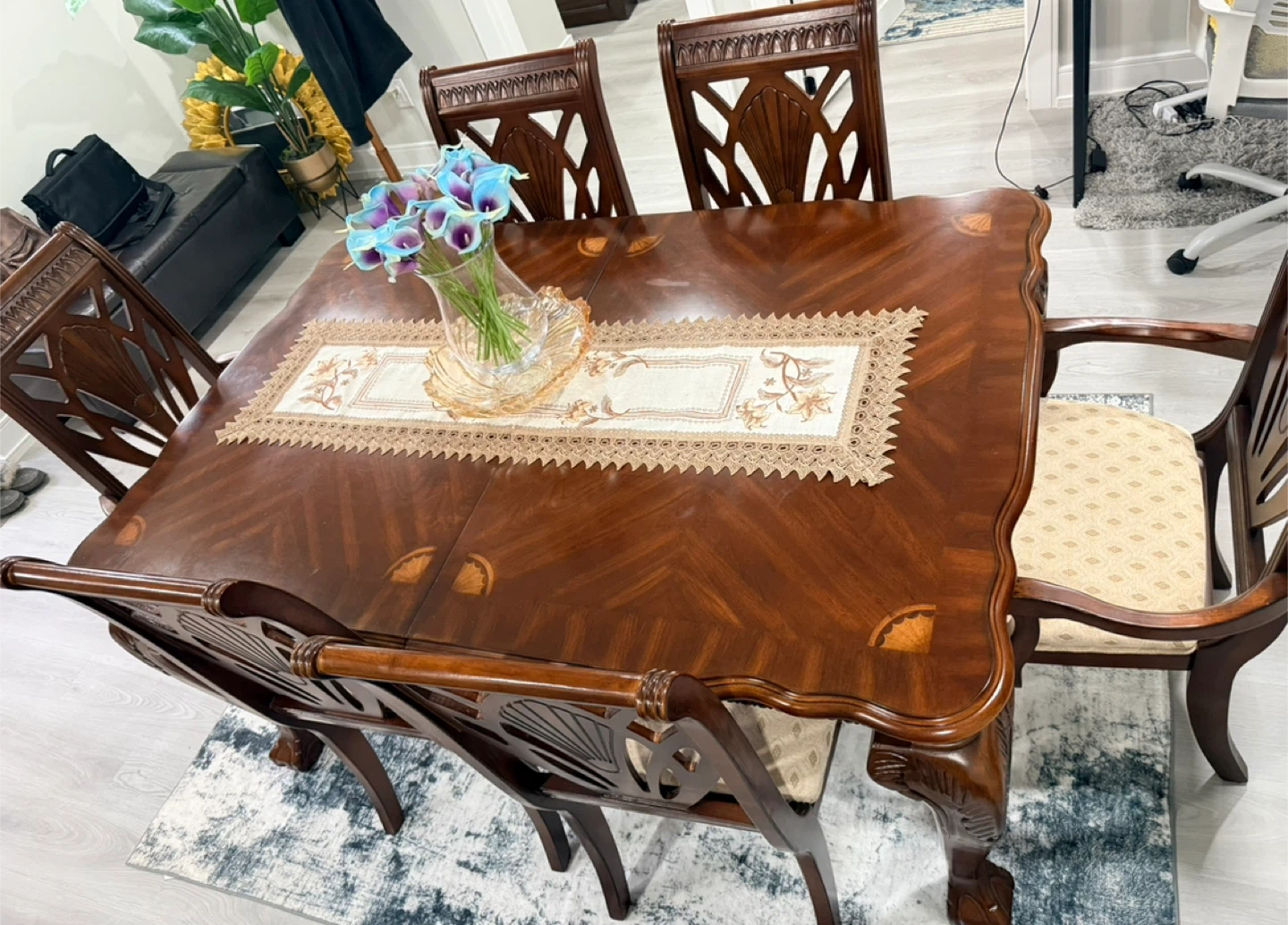 Entertain in style with this stunning 7- piece solid wood dining table set! Featuring an adjustable mid-section for versatility, this set is perfect for hosting family gatherings and dinner parties with friends. Minor scratches only add character to this beautifully crafted piece. Make unforgettable memories with your loved ones around this gorgeous dining table!