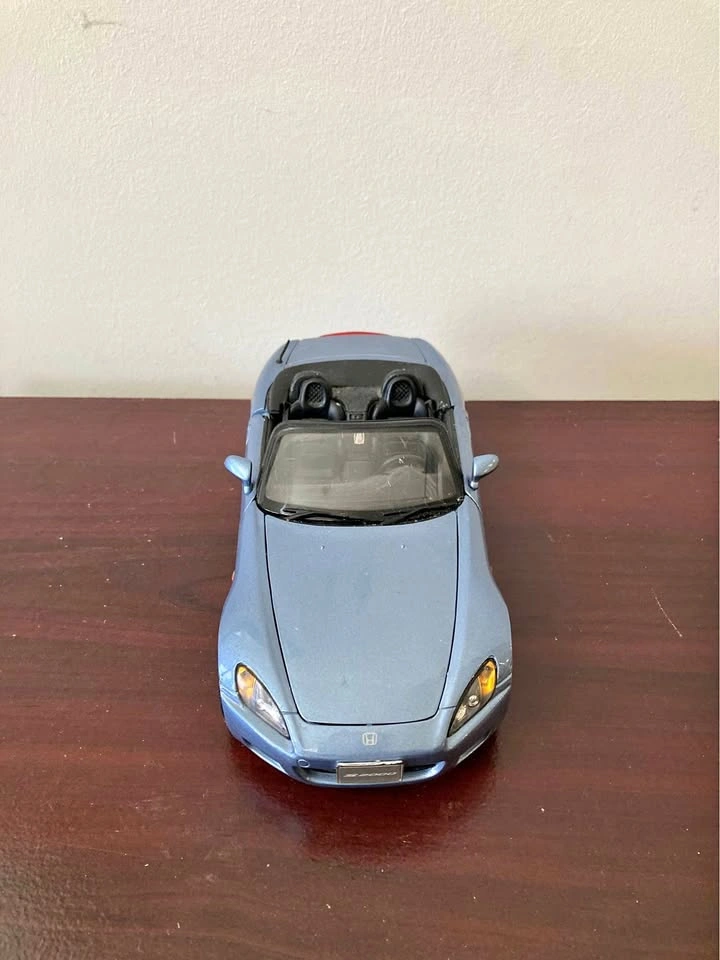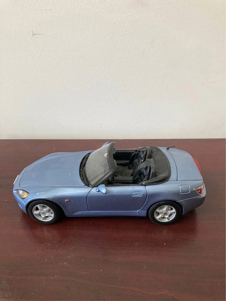 Detailed Honda S2000 1:18 scale diecast model car by Maisto in a sleek metallic blue finish. This collectible model captures the sporty design of the real S2000 convertible — a favorite among car enthusiasts. Features realistic interior detailing, rubber tires, and authentic markings on the base. Perfect for collectors, display cases, or as a gift for Honda or JDM fans. Features: • Brand: Maisto • Model: Honda S2000 • Scale: 1:18 • Color: Metallic blue • Material: Diecast metal with plastic parts • Details: Convertible top, detailed dashboard and seats, realistic chassis and exhaust system Condition notes: Gently used. Shows minor surface dust and small scuffs consistent with age. No missing parts.