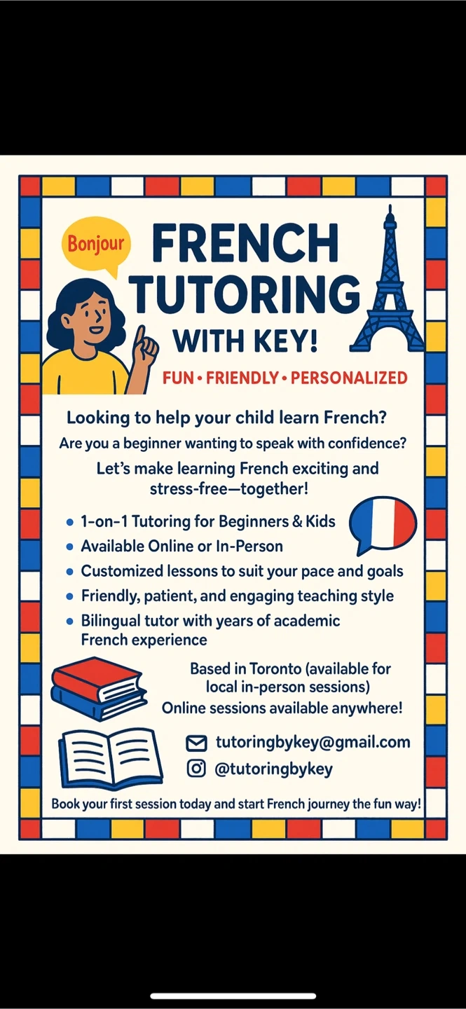 Looking to help your child learn French? This tutoring service offers 1-on-1 sessions for beginners and kids, available both online and in-person. Lessons are customized to suit your pace and goals, with a friendly, patient, and engaging teaching style. The tutor is bilingual with years of academic French experience, based in Toronto for local in-person sessions, but online sessions are available anywhere!