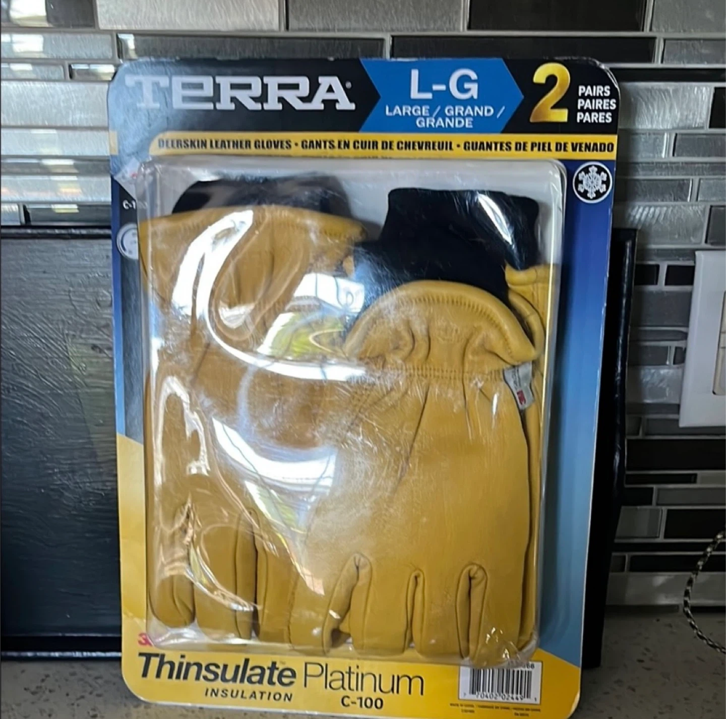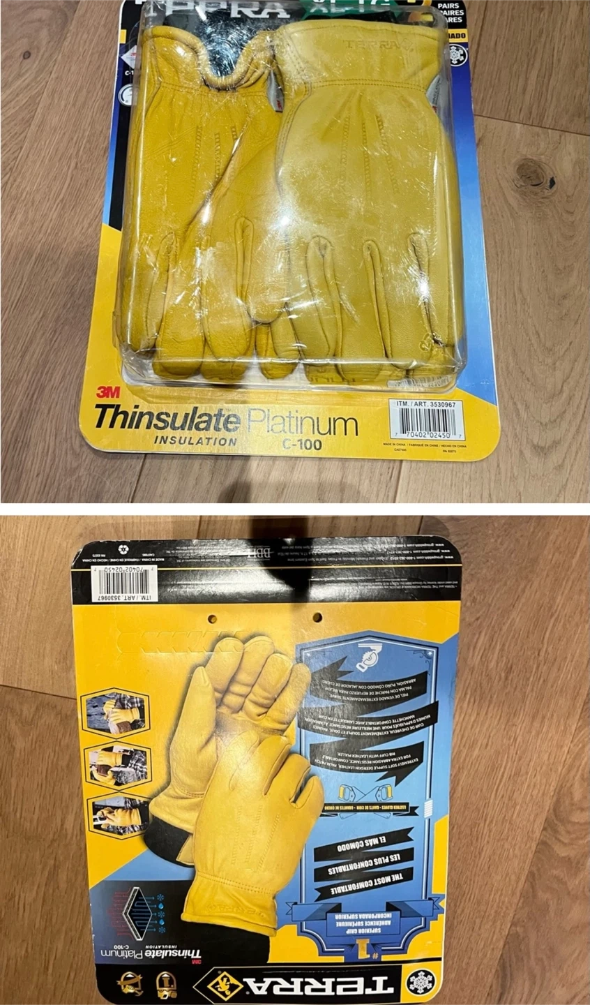 Terra deerskin leather gloves, size large and XL. These gloves feature 3M Thinsulate Platinum insulation C-100 for warmth and comfort. Includes two pairs of gloves each pack. $30 each pack of 2 pairs.