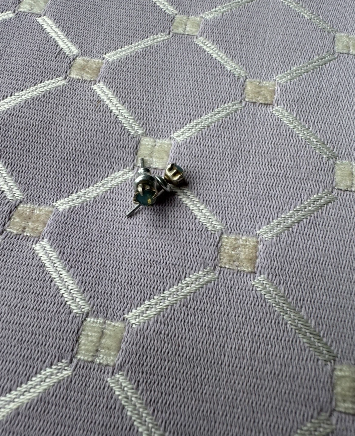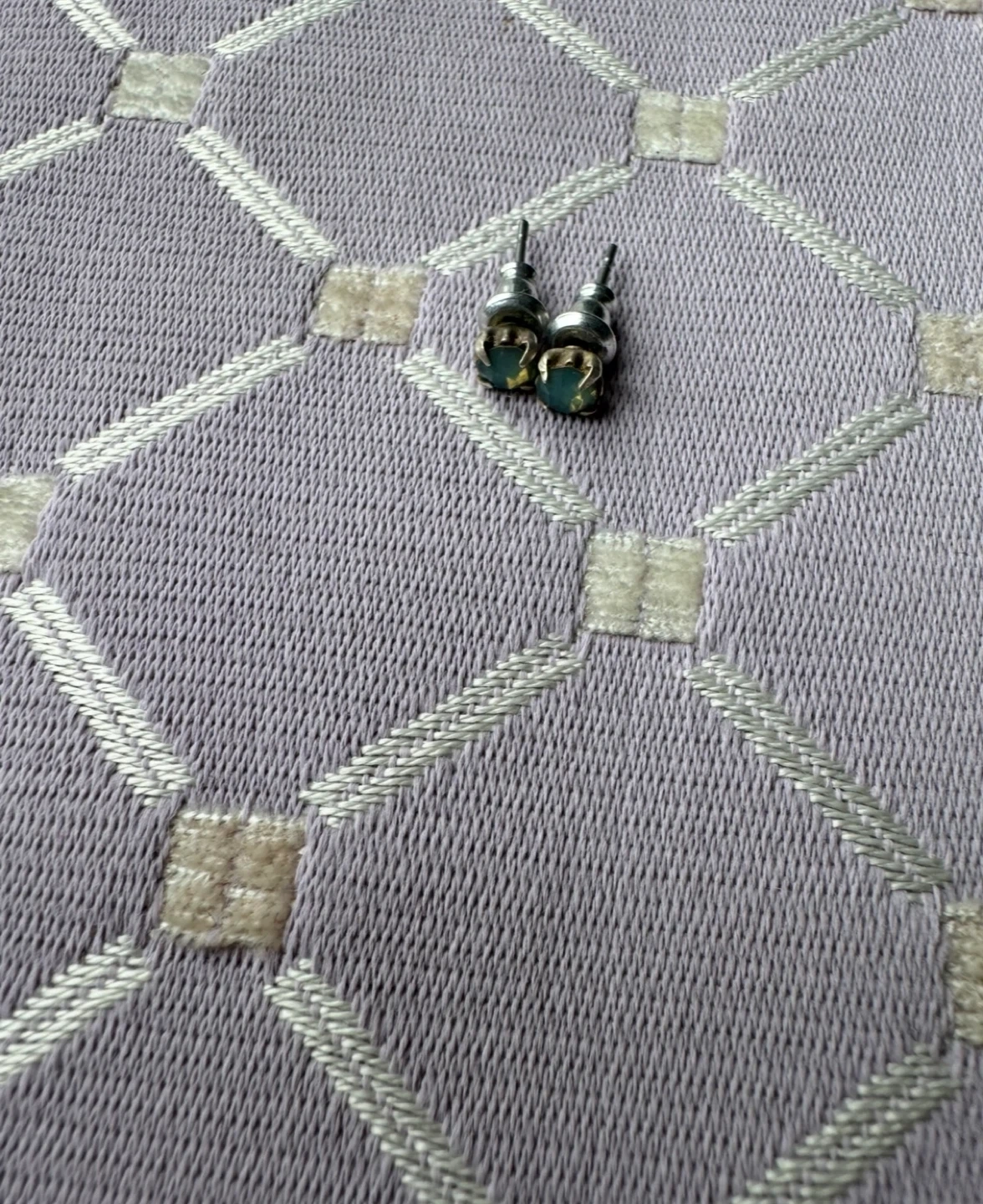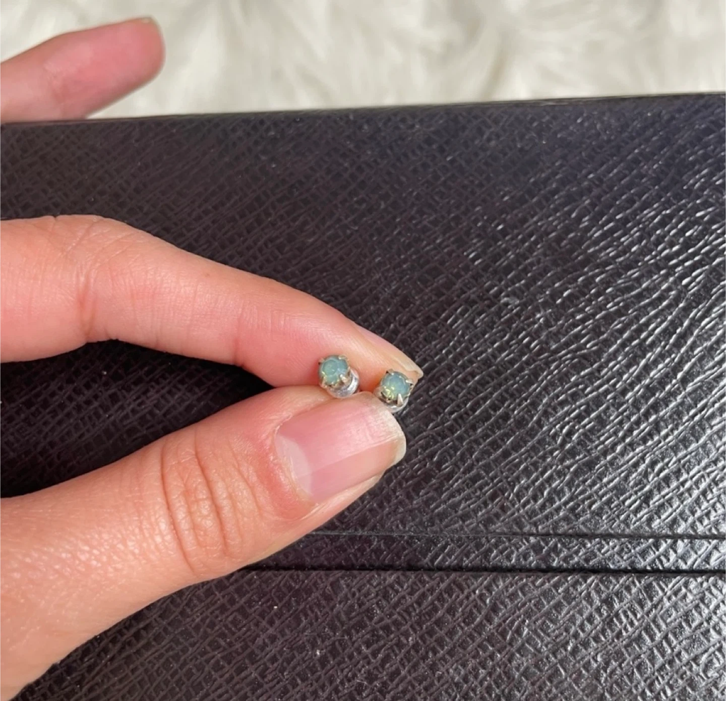 These are a pair of cute stud earrings. They have a silver-tone metal and a small, round stone in a light blue-green colour. They are in good condition and ready to wear