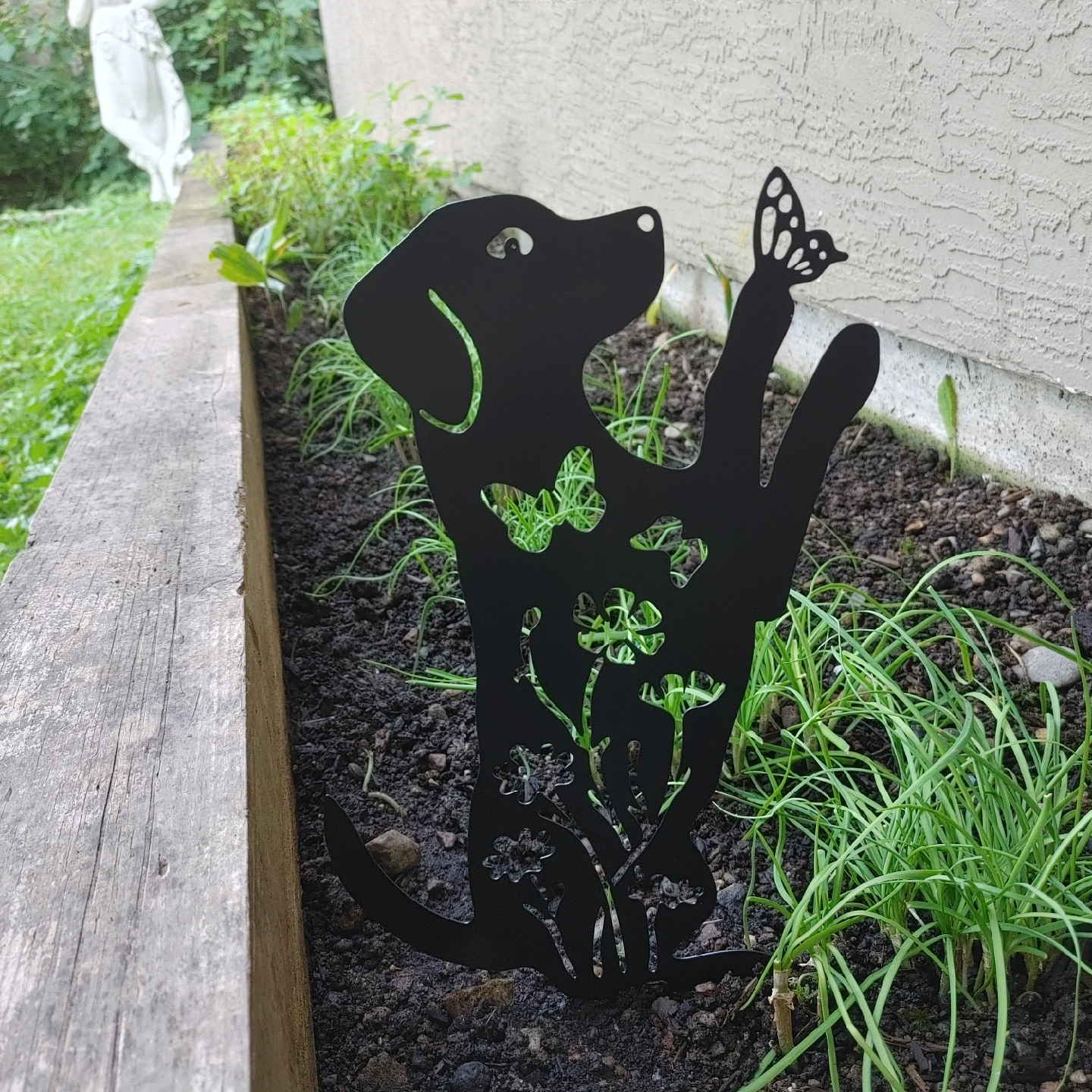 63Add a whimsical touch to your garden with this metal dog garden stake! It features a cute dog silhouette with a butterfly on its nose and flower cutouts. Perfect for adding some charm to your flower beds or lawn Dimensions. 13.8 inches tall and 7.5 inches wide, Almost new