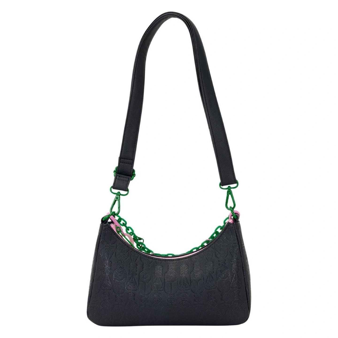 This crossbody bag features a debossed all-over print featuring various motifs that represent Glinda and Elphaba. For an extra cute touch, you'll find a pink chain handle and a green chain that drapes across the body of the bag. The green chain has pink and green charms attached, including a broomstick, butterfly, witch hat, and the Wicked "W”. Suitable for ages 8 and up.
