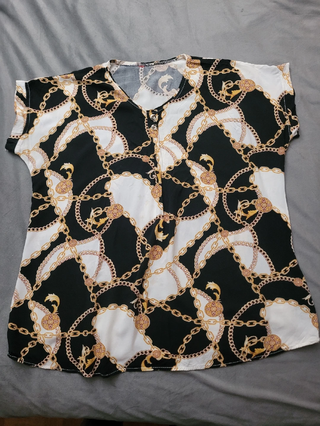 1000+Add a touch of vintage glam to your wardrobe with this striking chain print top, showcasing a bold black, white, and gold design. This is a used top. Features: * Eye-catching chain pattern * V-neck cut * Short sleeves Looking to add some shine to your closet? This gently-loved top is waiting for its next adventure. Don't miss out—if you're seeing this, it's still available!