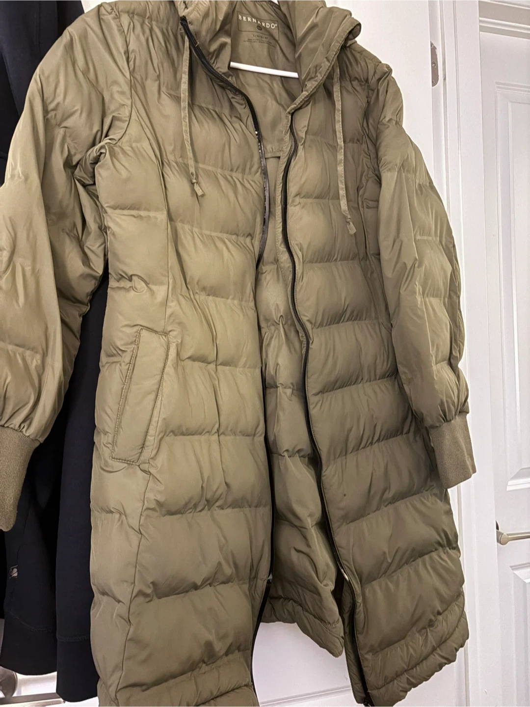 Selling a Bernardo down puffer coat in olive green. It's a size L/G/G. This coat is perfect for staying warm and stylish during the colder months!