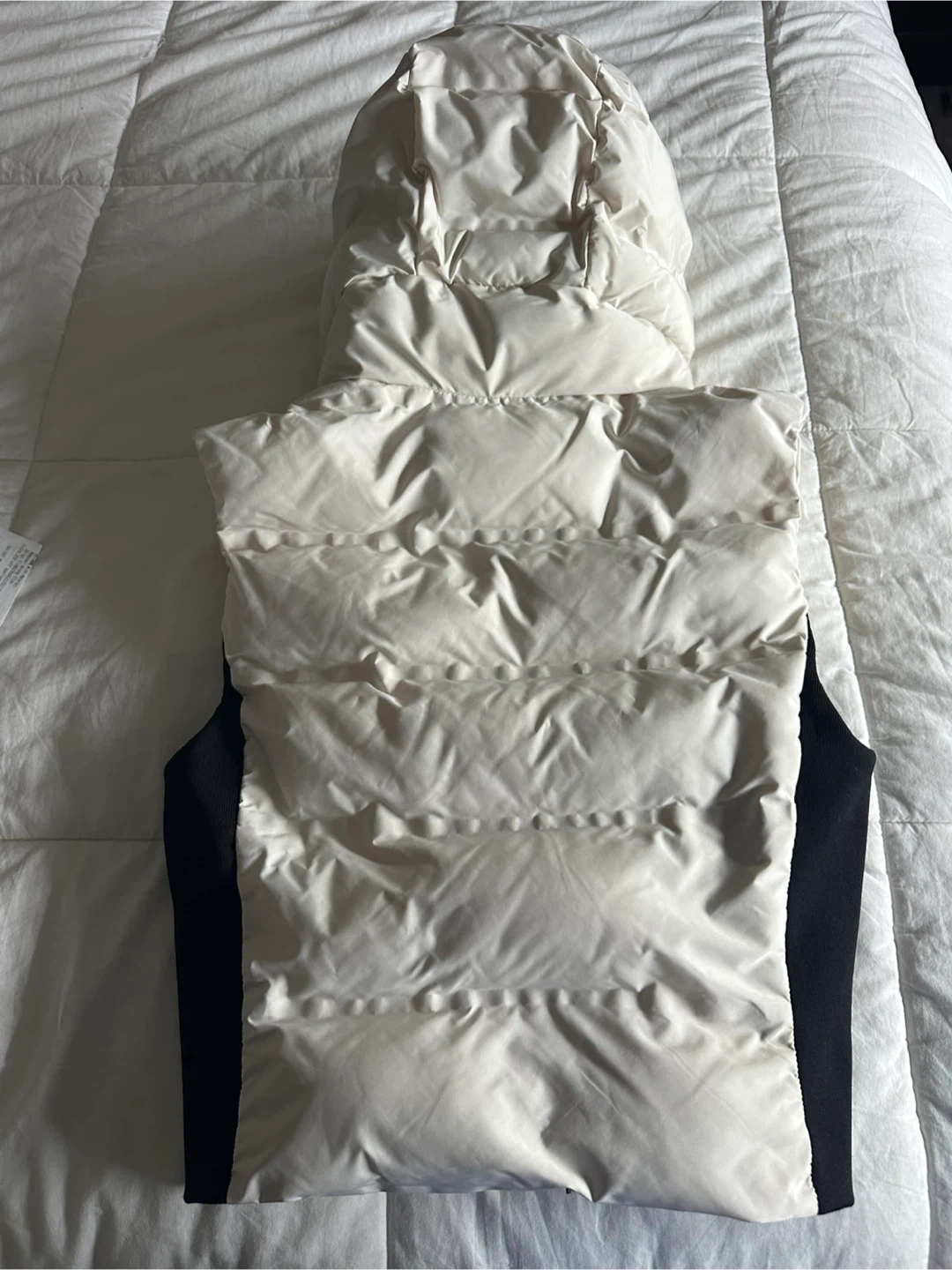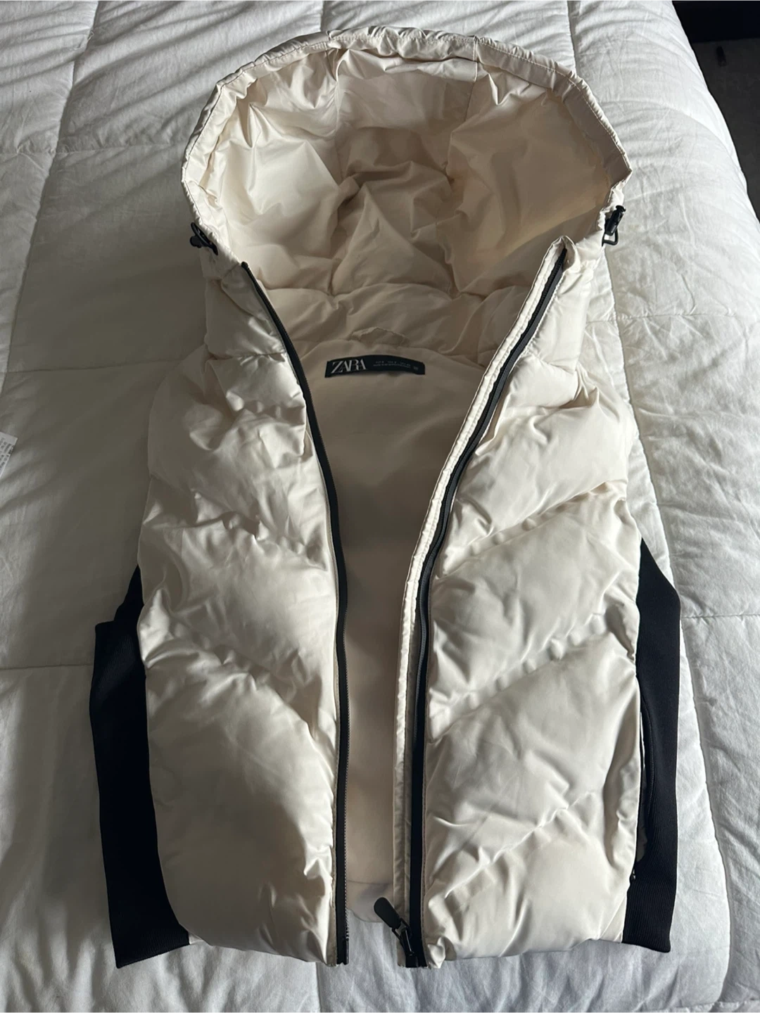 Selling a Zara white vest with a hood. It's in like new condition and perfect for layering. The vest is a size small and features black side panels. It's super cozy and stylish for the cooler weather!