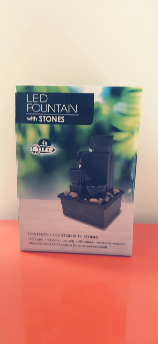 Selling a Spark Wave LED Fountain with Stones! It comes with the original box and includes the fountain and stones. This fountain is for indoor use only and has an LED light.