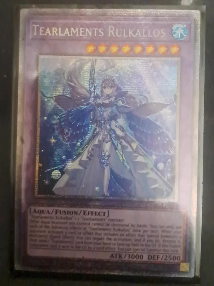 Selling a Tearlaments Rulkallos Yu-Gi-Oh! card. It's an Aqua/Fusion/Effect monster with ATK/3000 and DEF/2500. A great addition to any Yu-Gi-Oh! collection!