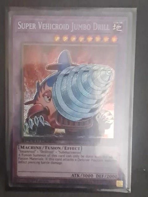 Selling a Yu-Gi-Oh! card: Super Vehicroid Jumbo Drill. It's a Machine/Fusion/Effect card. It requires "Steamroid", "Deliroid", and "Submarineroid" as fusion materials. Its attack is 3000 and defense is 2000