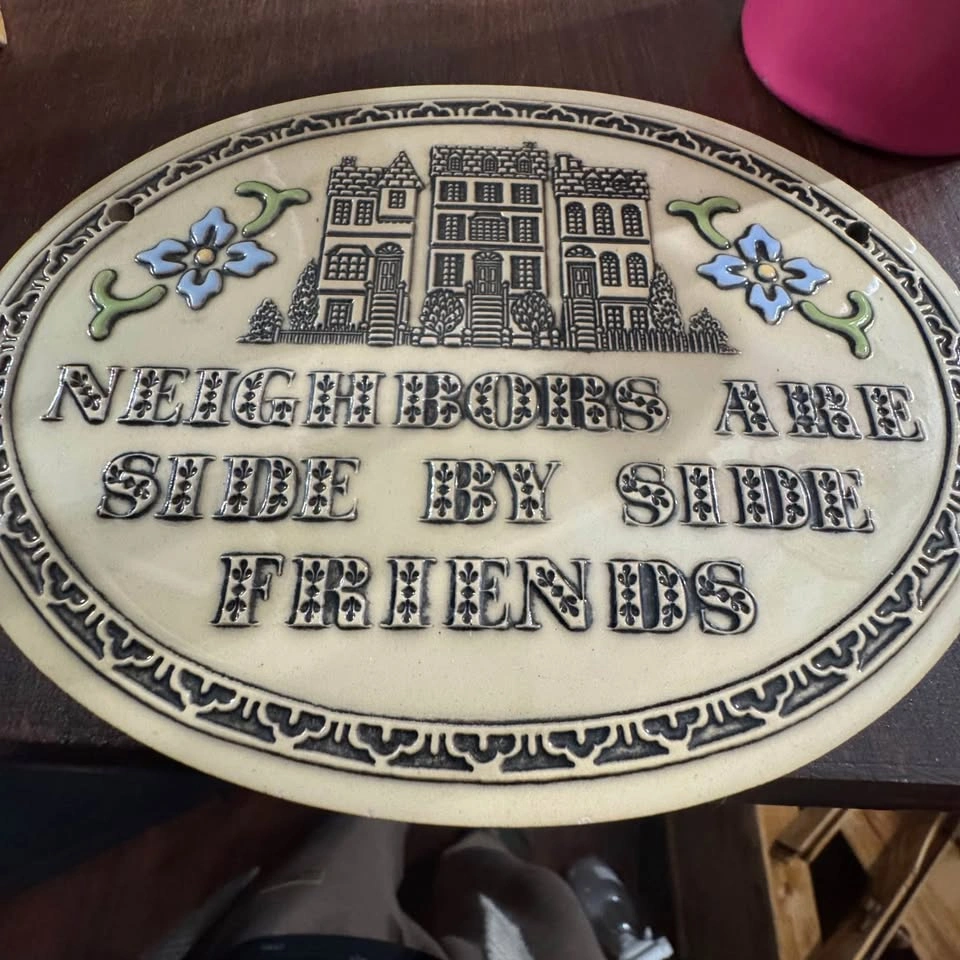 VINTAGE TRINITY POTTERY Spooner WI 1987 Ceramic Wall Plaque – “Neighbors Are Side by Side Friends”. Add a touch of charm to your home or garden with this vintage-style ceramic wall plaque. Features raised lettering and a sweet design of row houses with floral accents. Perfect for welcoming guests or gifting to a friendly neighbor!