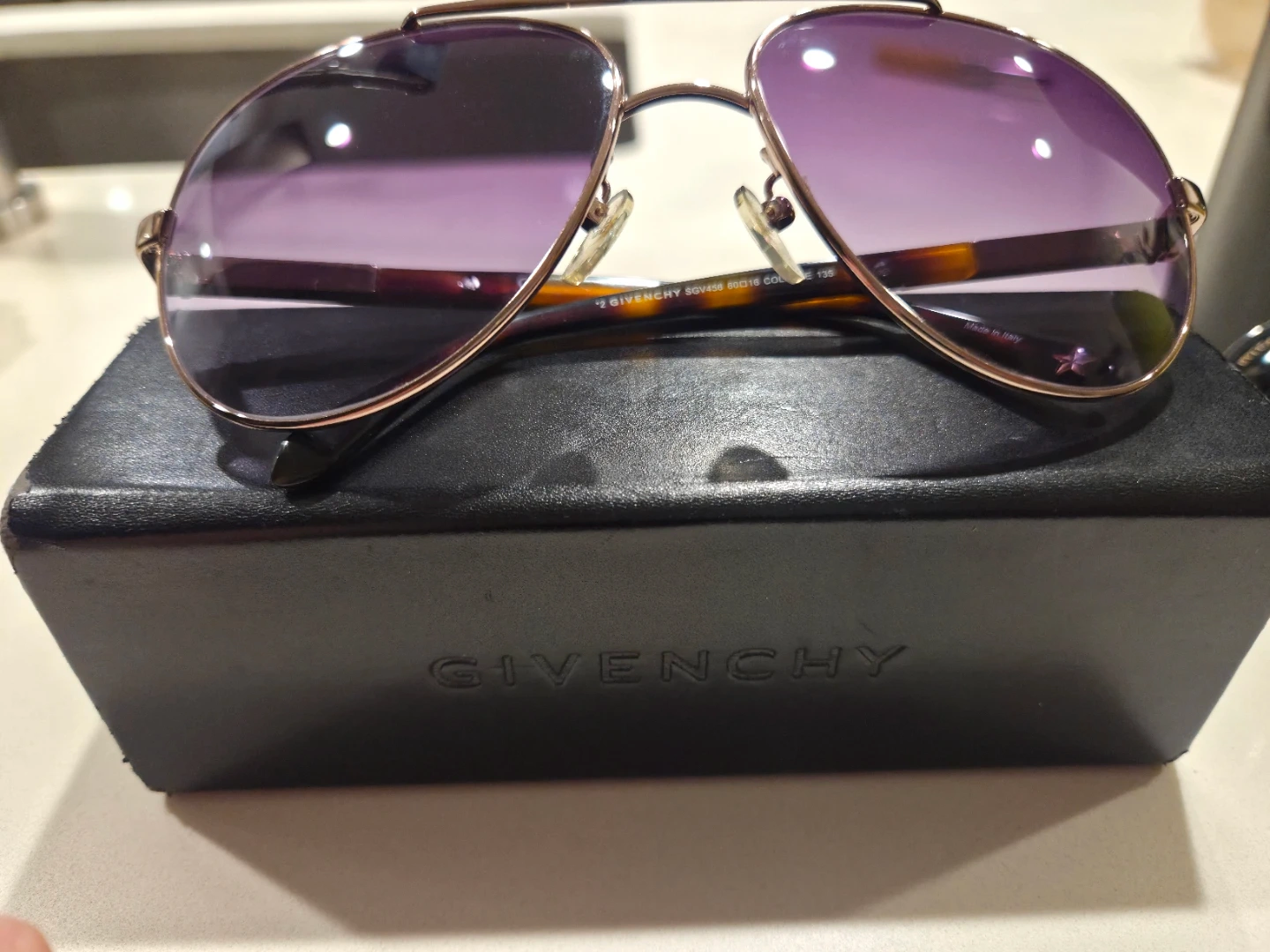 Selling a pair of Givenchy sunglasses. They are in like new condition and come with the original case. Under bright white lighting and up close camera the tint looks purple but when wearing it has a dark brown shade.