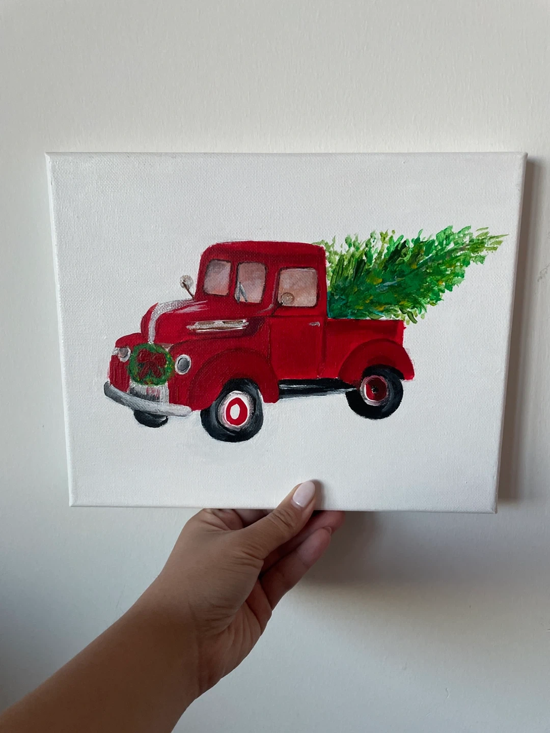 85A cute canvas painting of a red truck carrying a Christmas tree! Perfect for adding a festive touch to your home decor during the holiday season. It's Oil color and handmade Size:10" *8"