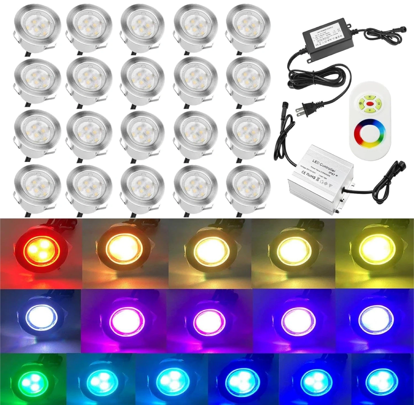 20pcs Low Voltage LED Deck Lights Kits Multi-Color RGB Stainless Steel Waterproof Outdoor Recessed Wood Decoration Lamps Landscape Pathway Patio Step Stairs LED In-ground Lighting(Silver Border)