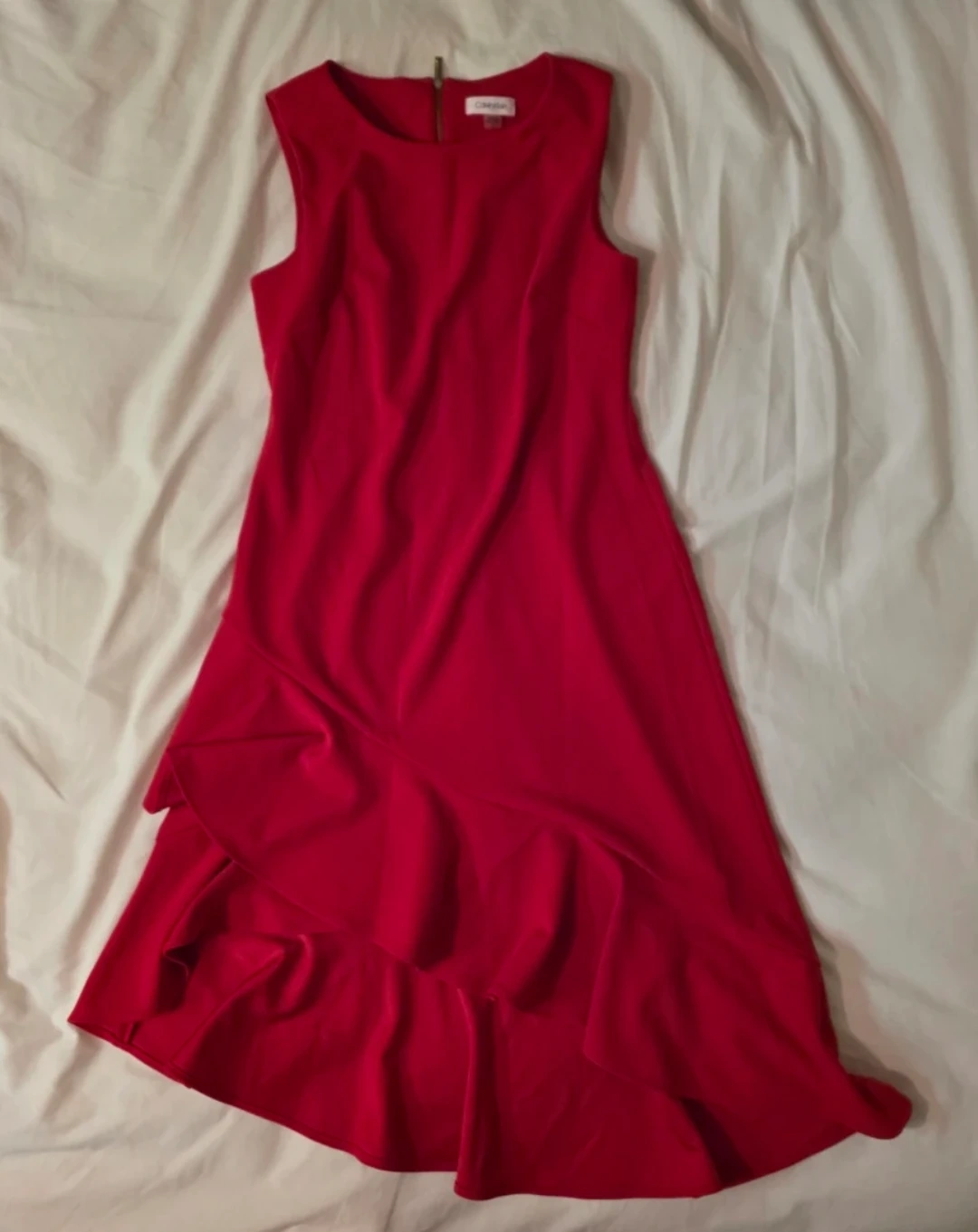 Momma is updating her wardrobe. Selling a lovely Calvin Klein dress in a vibrant red colour! It's a size 10 and has a stylish ruffle detail. Perfect for a special occasion or a night out