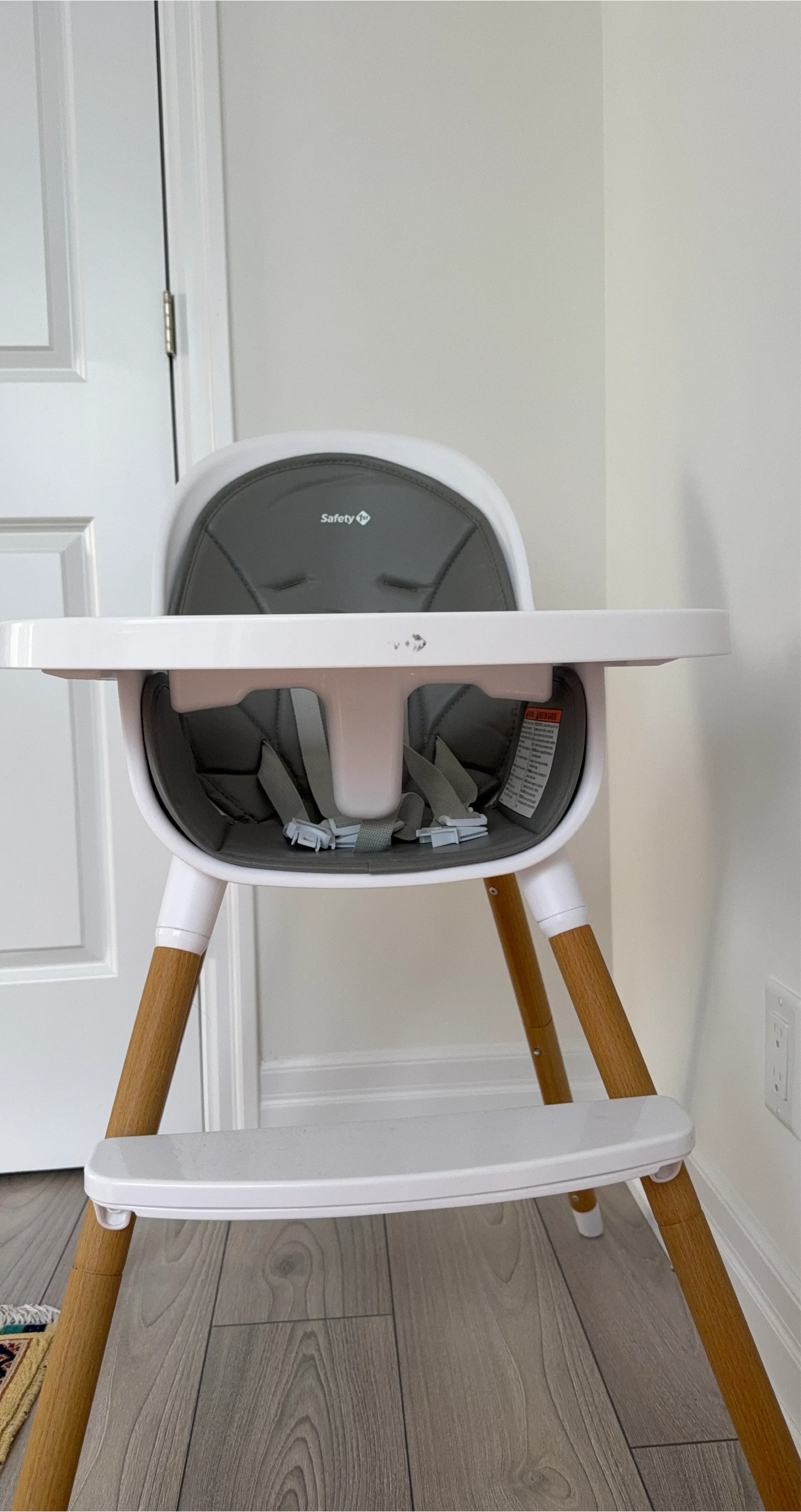 This Safety 1st high chair features a white and grey design with wooden legs. It has a removable tray and a 5-point harness for safety. The seat pad is upholstered for comfort. It's a great option for feeding little ones.