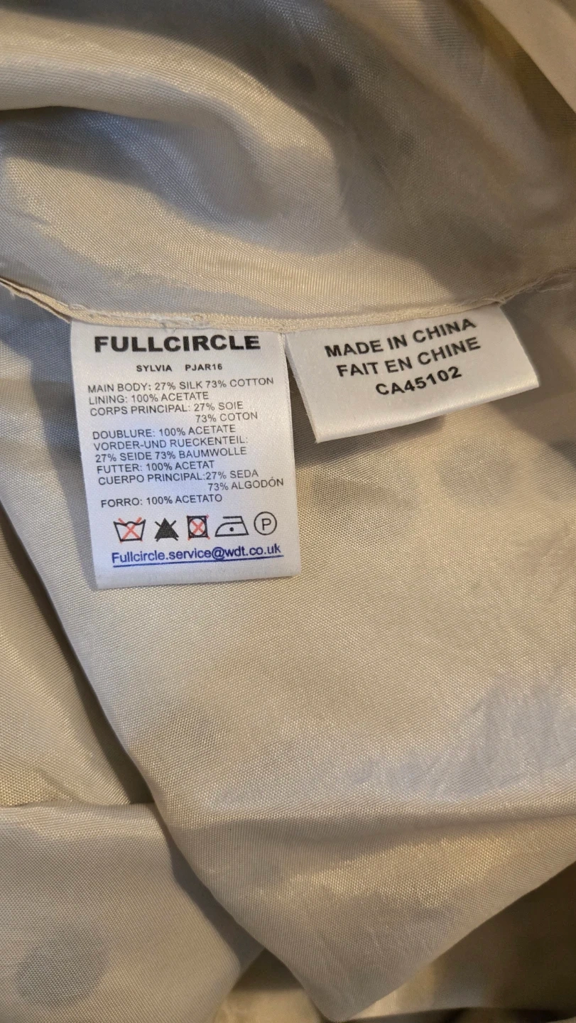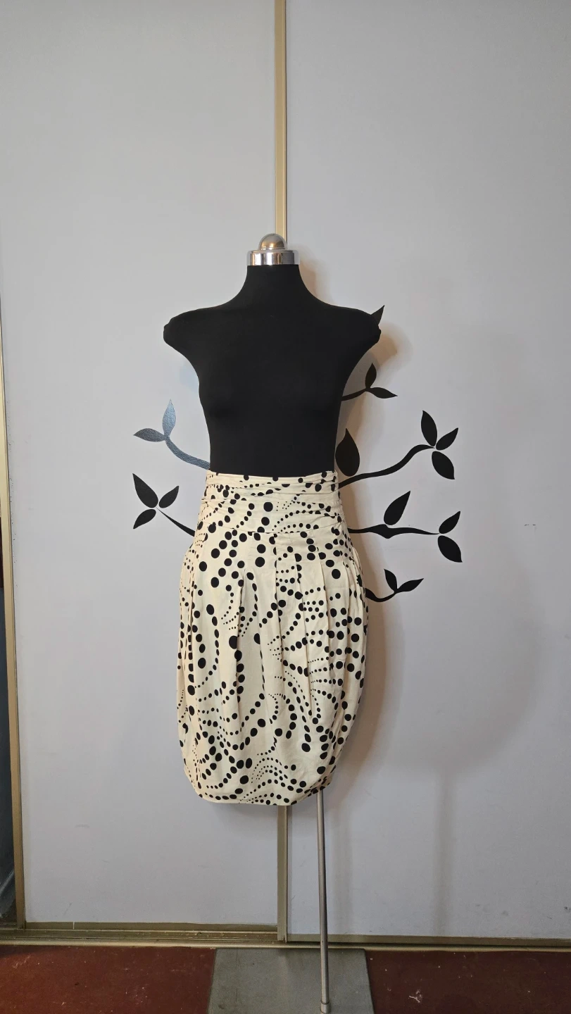 This unique Full Circle skirt is in great condition. It features a beige background with a black dot pattern. The main body is made of 27% silk and 73% cotton, while the lining is 100% acetate.