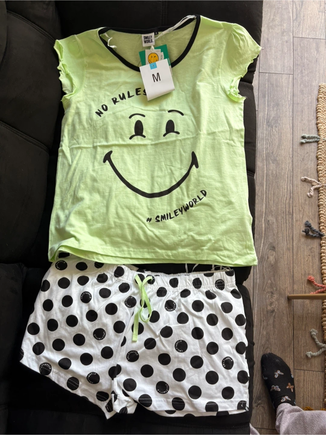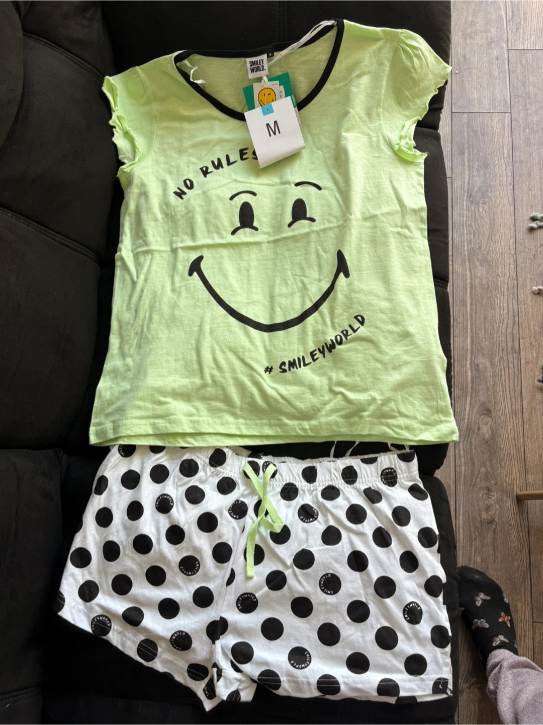 Selling a brand new Smiley World pajama set! The set includes a cute, light green top with a smiley face and black trim, and white shorts with black polka dots. It's a size medium and would be perfect for lounging around the house