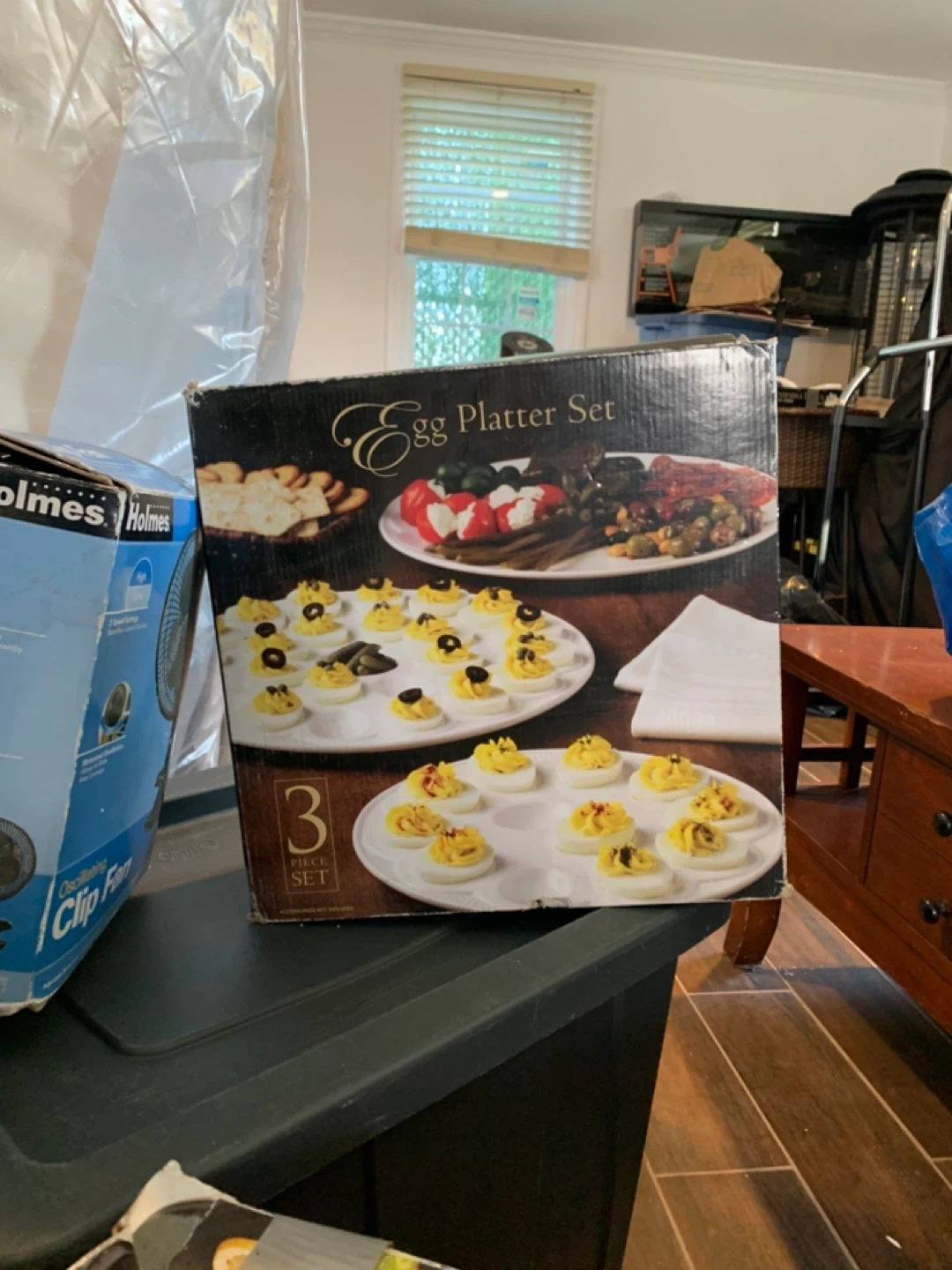 Selling an egg platter set. It's a 3-piece set, perfect for serving deviled eggs and other appetizers at your next gathering!