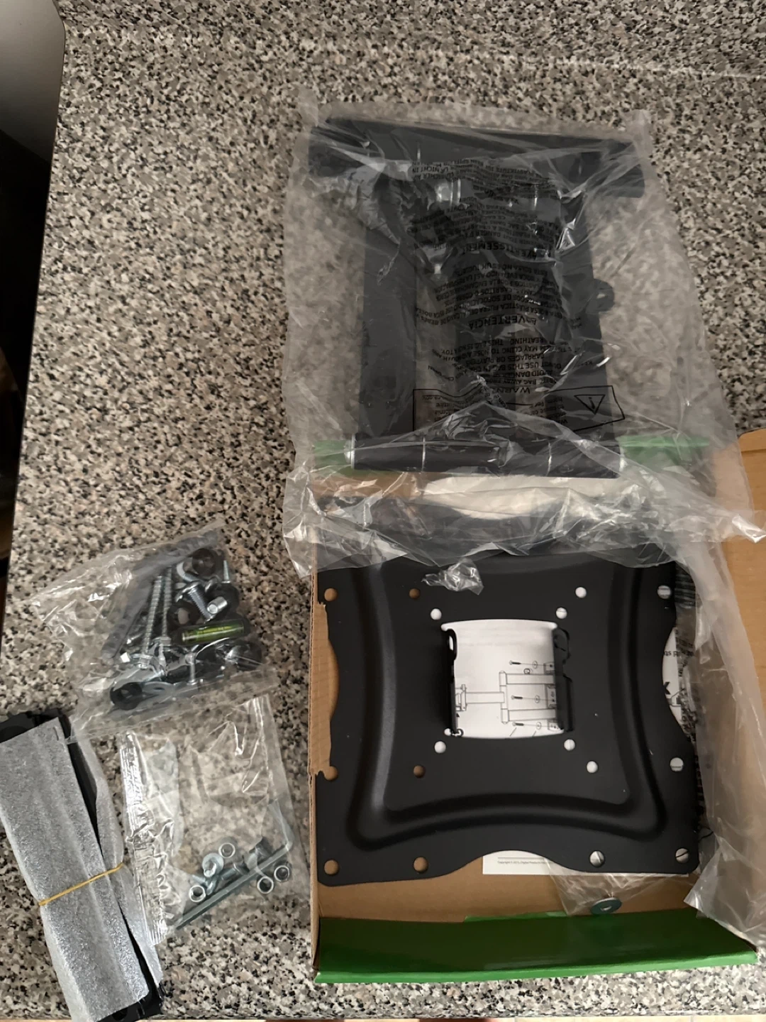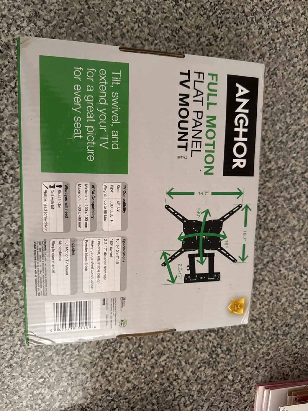 Selling an Anchor full motion flat panel TV mount, model TM46B. It's compatible with TVs sized 13"-65" and weighing up to 66 lbs. The mount allows you to tilt, swivel, and extend your TV for a great picture from any seat. It provides a 2.3"-16.7" clearance from the wall and features heavy-gauge steel construction with a powder black finish. Includes all hardware for a full motion TV mount.