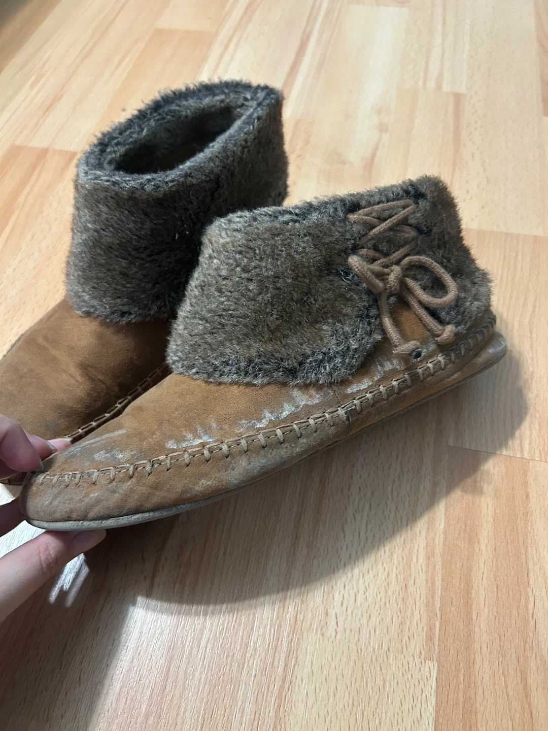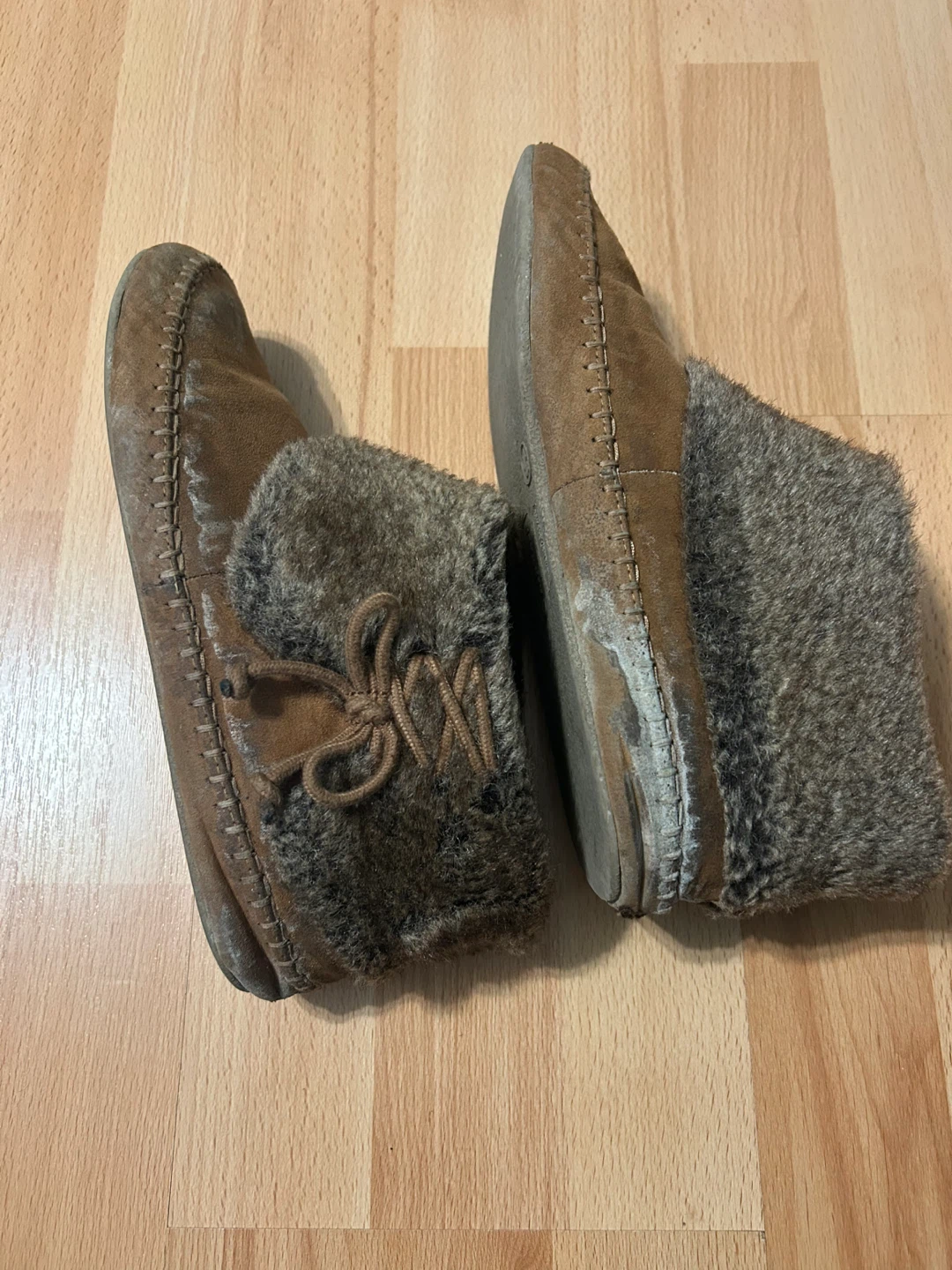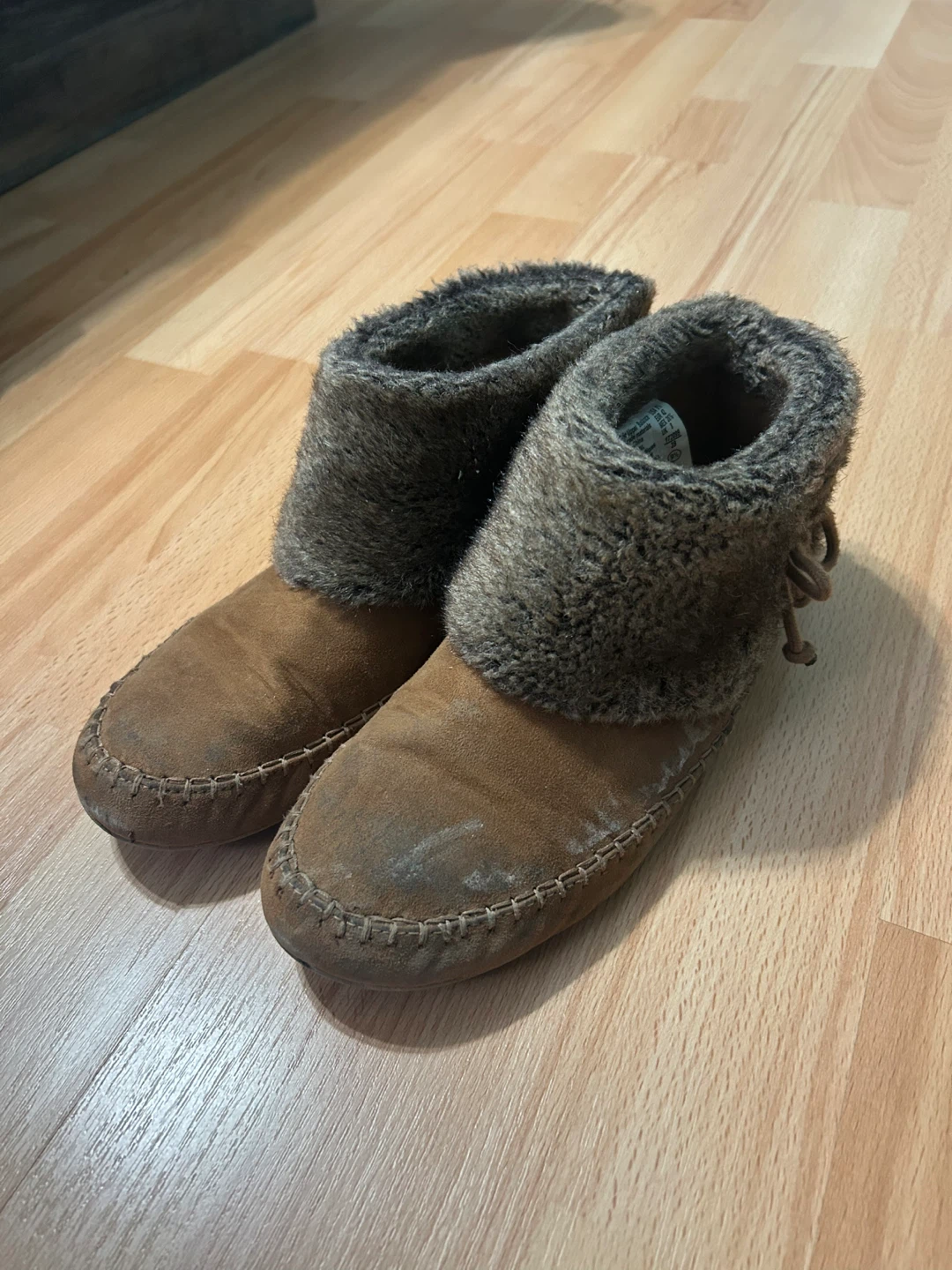 Cozy up with these Airwalk moccasin boots! They feature a soft brown suede exterior and warm fur lining. See pictures for wear caused by salt last year. Size 9.5.