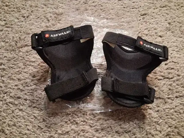 26These are a new pair of Airwalk Youth size small/medium elbow pads, still in the original packaging. Perfect for skateboarding, rollerblading, or any activity where a little extra protection is needed. The label indicates that they are made of polypropylene, ethylene-vinyl acetate, and nylon. Keep those elbows safe and sound while you're out there having a blast!
