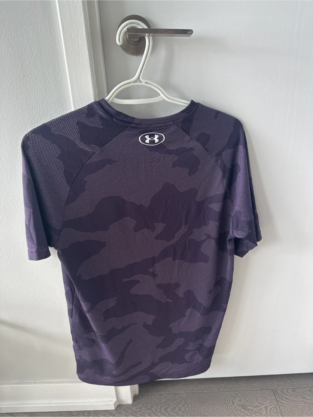Selling a purple camo t-shirt from Under Armour. It's in great condition and perfect for workouts or casual wear. The material is lightweight and breathable, making it super comfy.