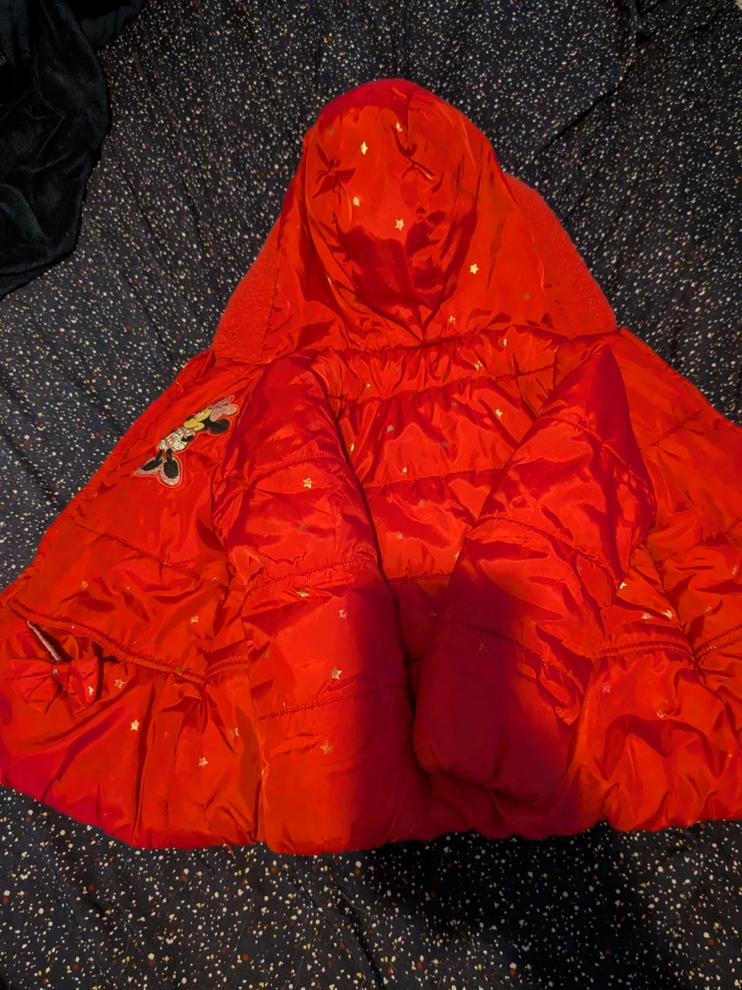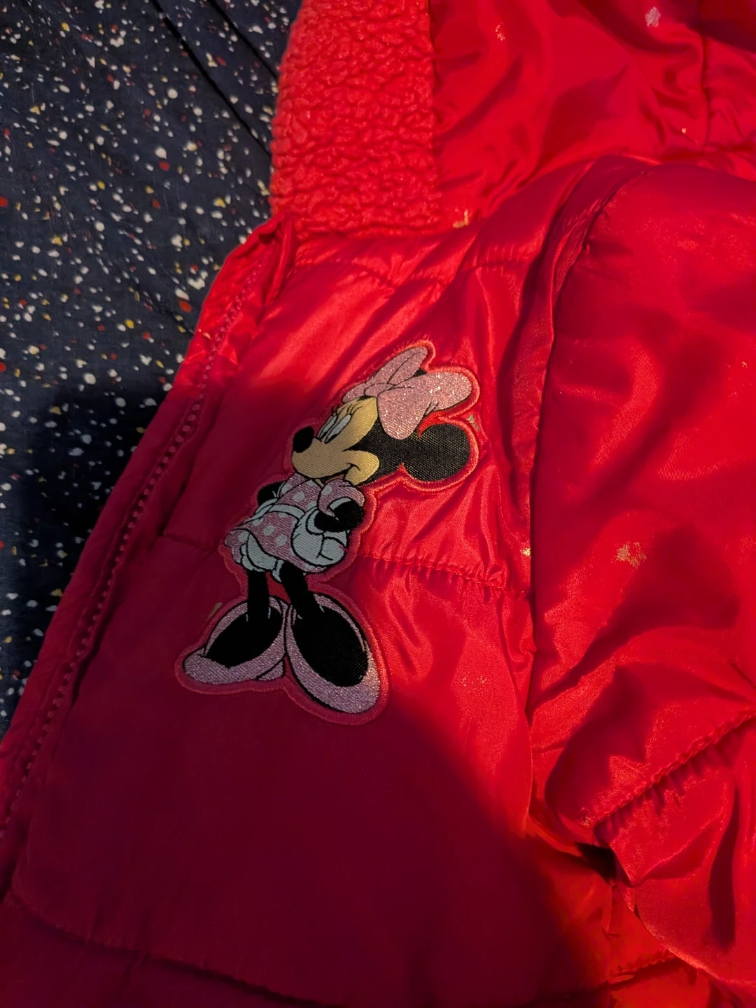 A cute red puffer jacket from the Disney Store! It features a Minnie Mouse design and is sized for a child in size 4 (up to 104cm). It's in great condition and perfect for keeping your little one warm and stylish