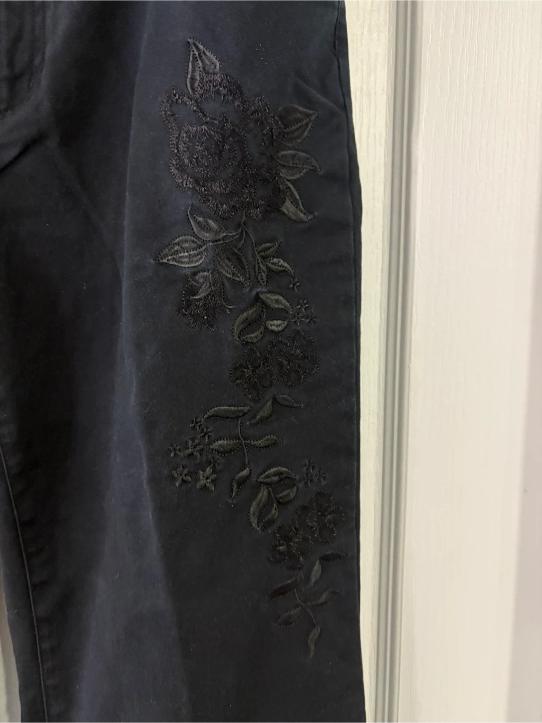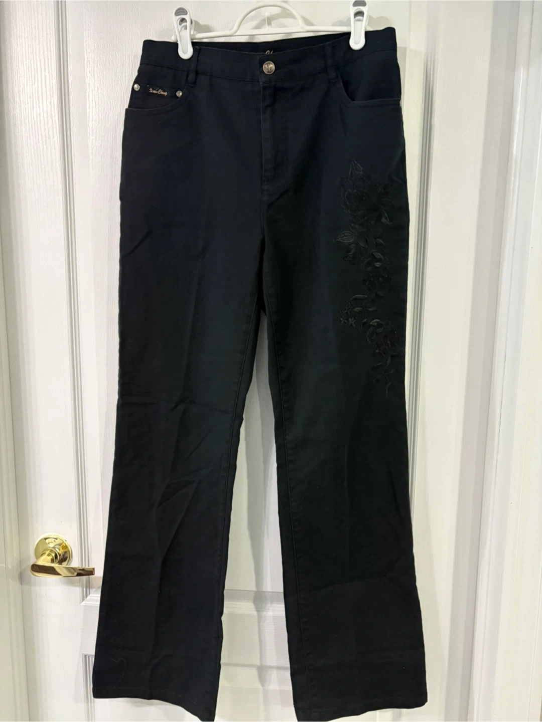 Vintage Pants - Simon Chang 👖 size 8 feature a stylish floral design on the leg 97% cotton 3% elastane. Perfect for everyday wear!